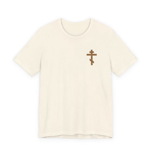 Small Embroidered Orthodox Cross | Earthtones | May I Never Boast Except in the Cross (Gal 6:14) | Christian Cotton Unisex T-Shirt