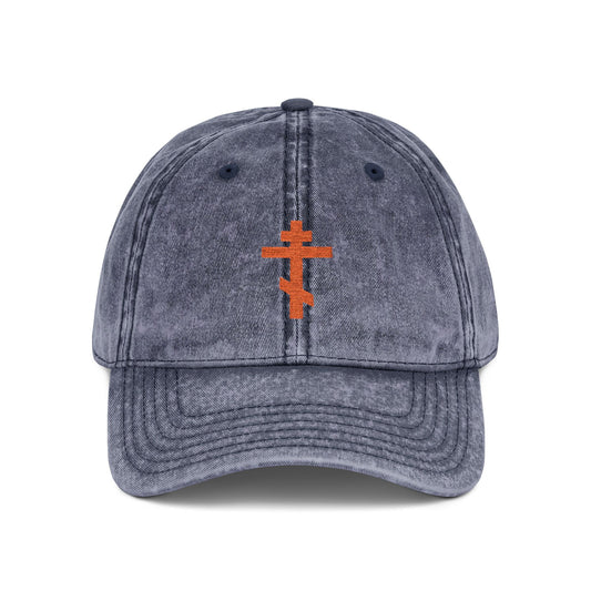 Simple Red-Orange Orthodox TriBar Cross | Crucify My Ego to the Precious and Life Giving Cross | Minimalist Christian Distressed Embroidered Cap