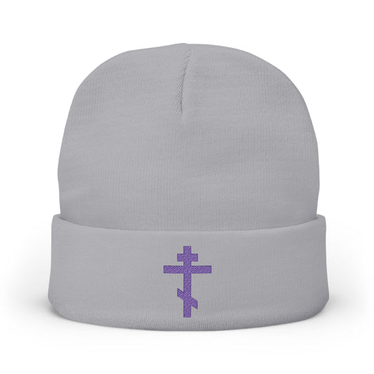 Simple Blue-Purple Orthodox TriBar Cross | Nail My Passions to the Wood of Thy Precious Cross O Lord | Orthodox Christian Embroidered Knit Beanie