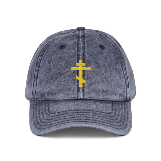 Simple Yellow Orthodox TriBar Cross | Crucify My Ego to the Precious and Life Giving Cross | Minimalist Christian Distressed Embroidered Cap