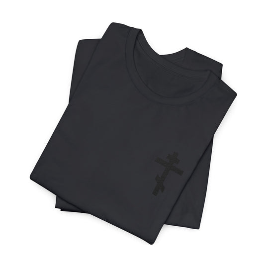 Black on Black Embroidered Orthodox Cross | May I Never Boast Except in the Cross of Christ (Gal 6:14) | Christian Cotton Unisex T-Shirt