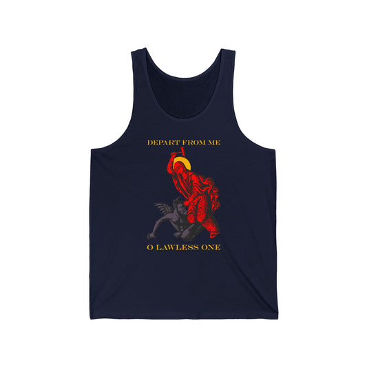 St Marina IconoGraphic (Depart from Me O Lawless One) | Saint Beating the Devil with a Hammer | Bestselling Orthodox Christian Jersey Tank Top / Sleeveless Shirt