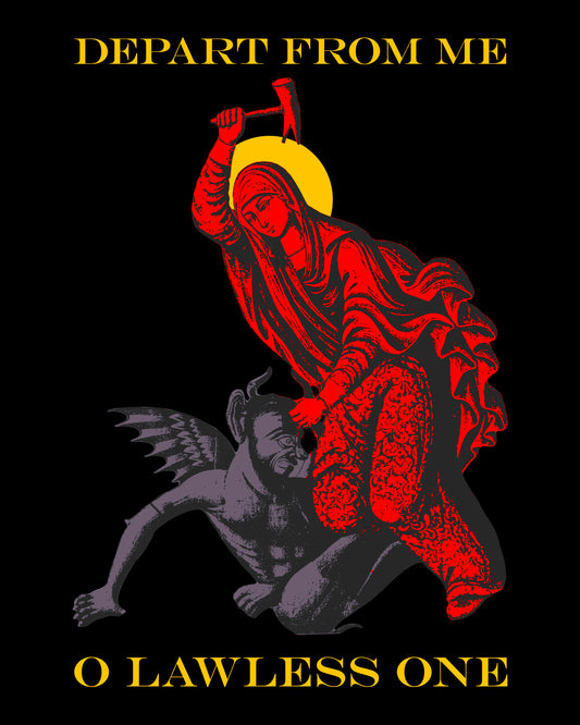 St Marina IconoGraphic (Depart from Me O Lawless One) | Saint Beating the Devil with a Hammer | Bestselling Orthodox Christian T-Shirt