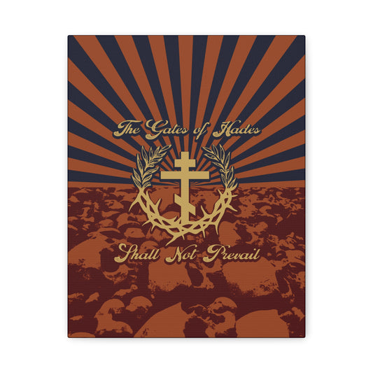 The Gates of Hades Shall Not Prevail | Cross with Wreath & Crown of Thorns | Skulls and Rays | Orthodox Christian Canvas Art