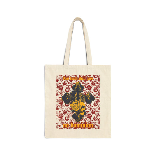 And Death Shall Have No Dominion (Dylan Thomas) | Gothic Style Cross, Skull & Rose on Floral Background | Orthodox Christian Canvas Tote Bag