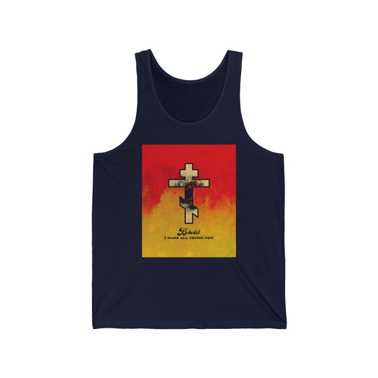 Behold, I Make All Things New (Rev 21:5) | Cosmic Orthodox Cross on Red and Yellow Background | Orthodox Christian Jersey Tank Top / Sleeveless Shirt