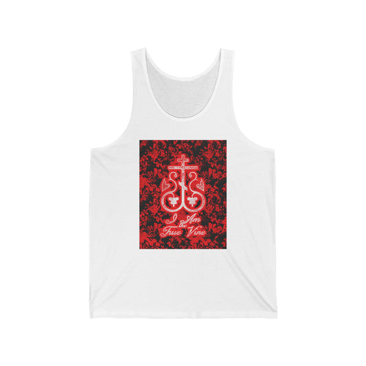 I Am the True Vine (John 15:1) | Orthodox Cross Vine Monogram | Red and Black Floral Design | Orthodox Christian Tank Top