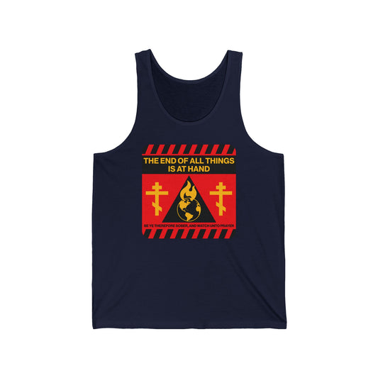 The End of All Things Is At Hand (1 Peter 4:7) | Striking Red and Yellow Street Sign Apocalyptic Aesthetic | Orthodox Christian Tank Top