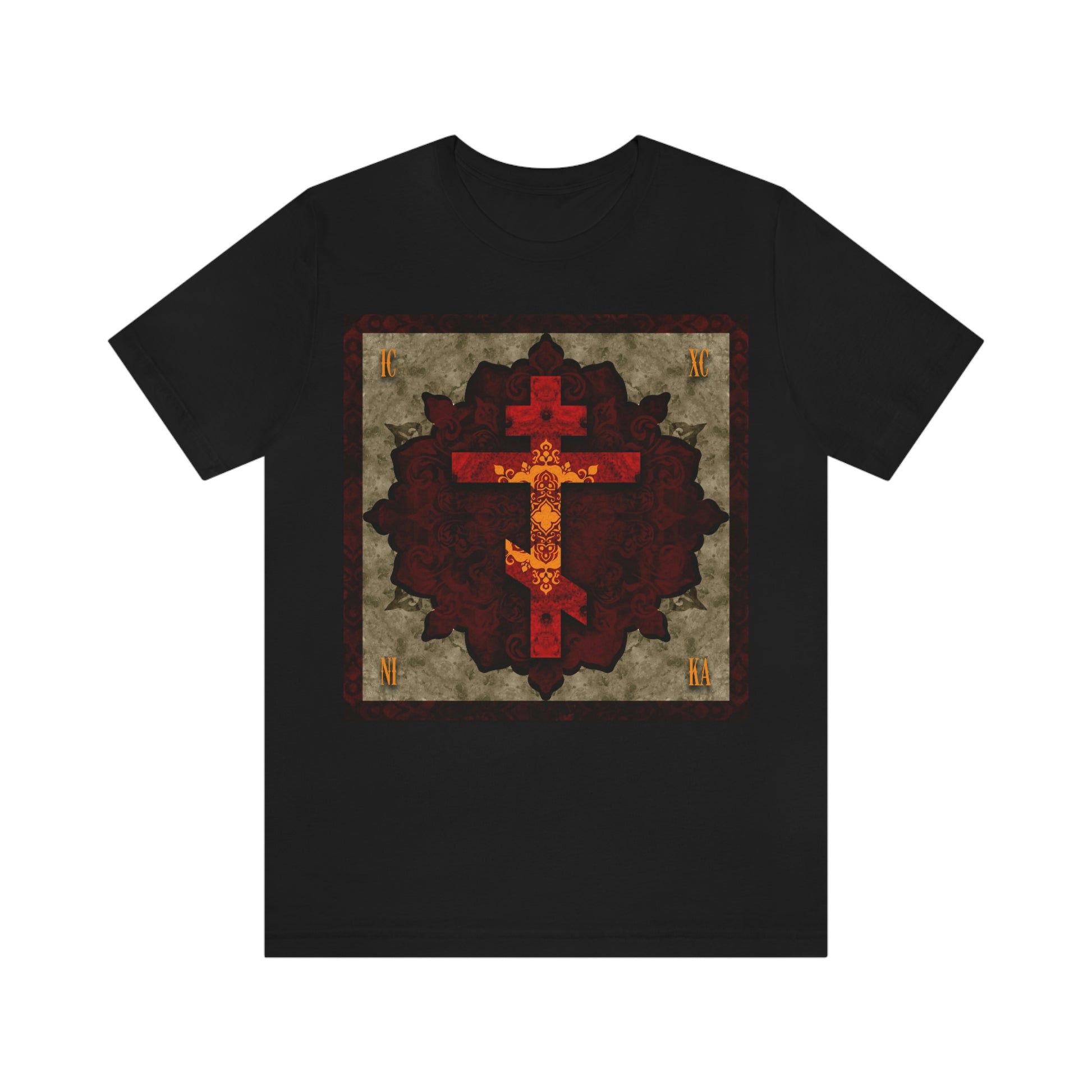 ICXC NIKA Artistic Textured Red & Gold Russian Cross | Orthodox Christian T-Shirt