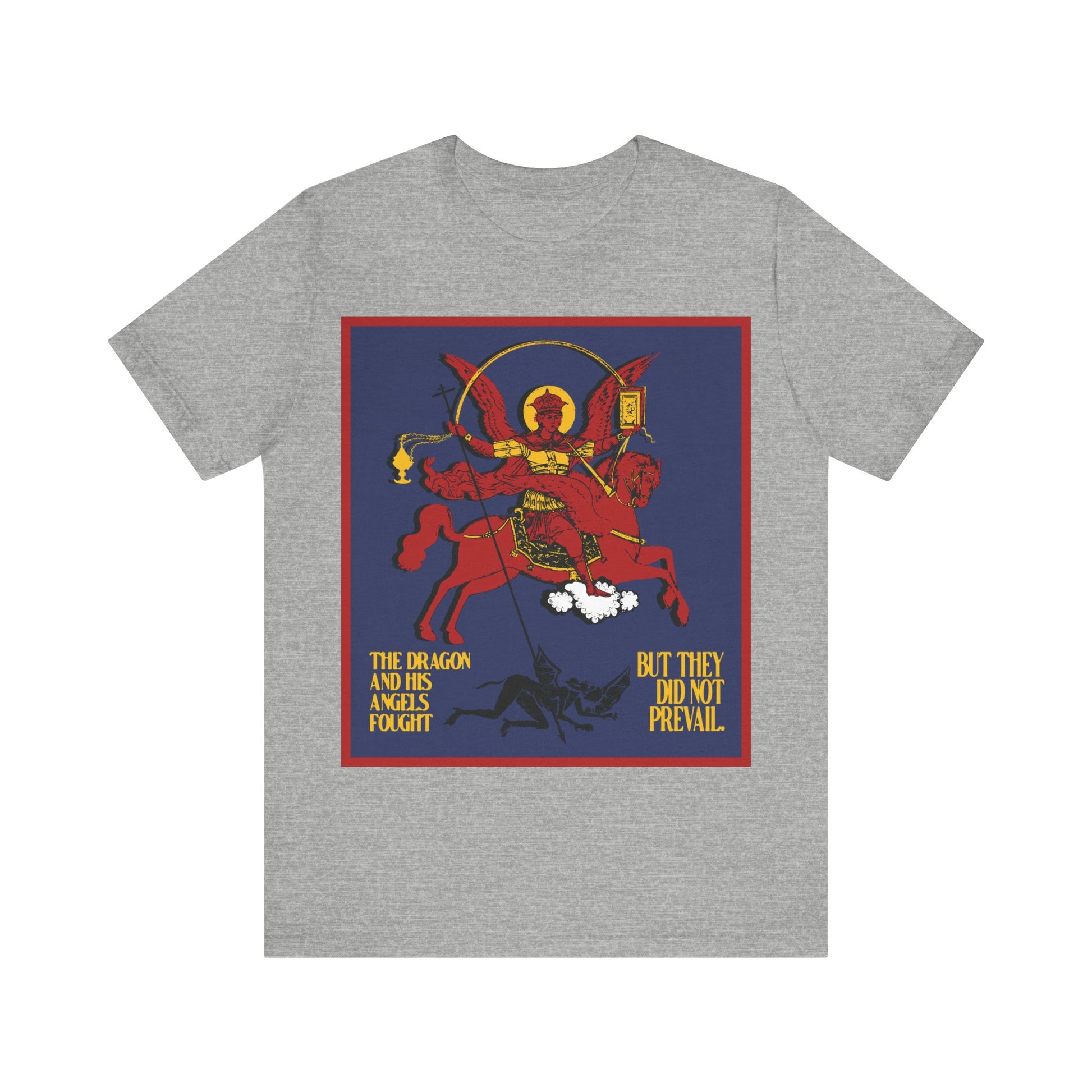 Archangel Michael of the Apocalypse IconoGraphic (Revelation 12:7-8) | Red Angel and Horse on Blue Background | Orthodox Christian T-Shirt