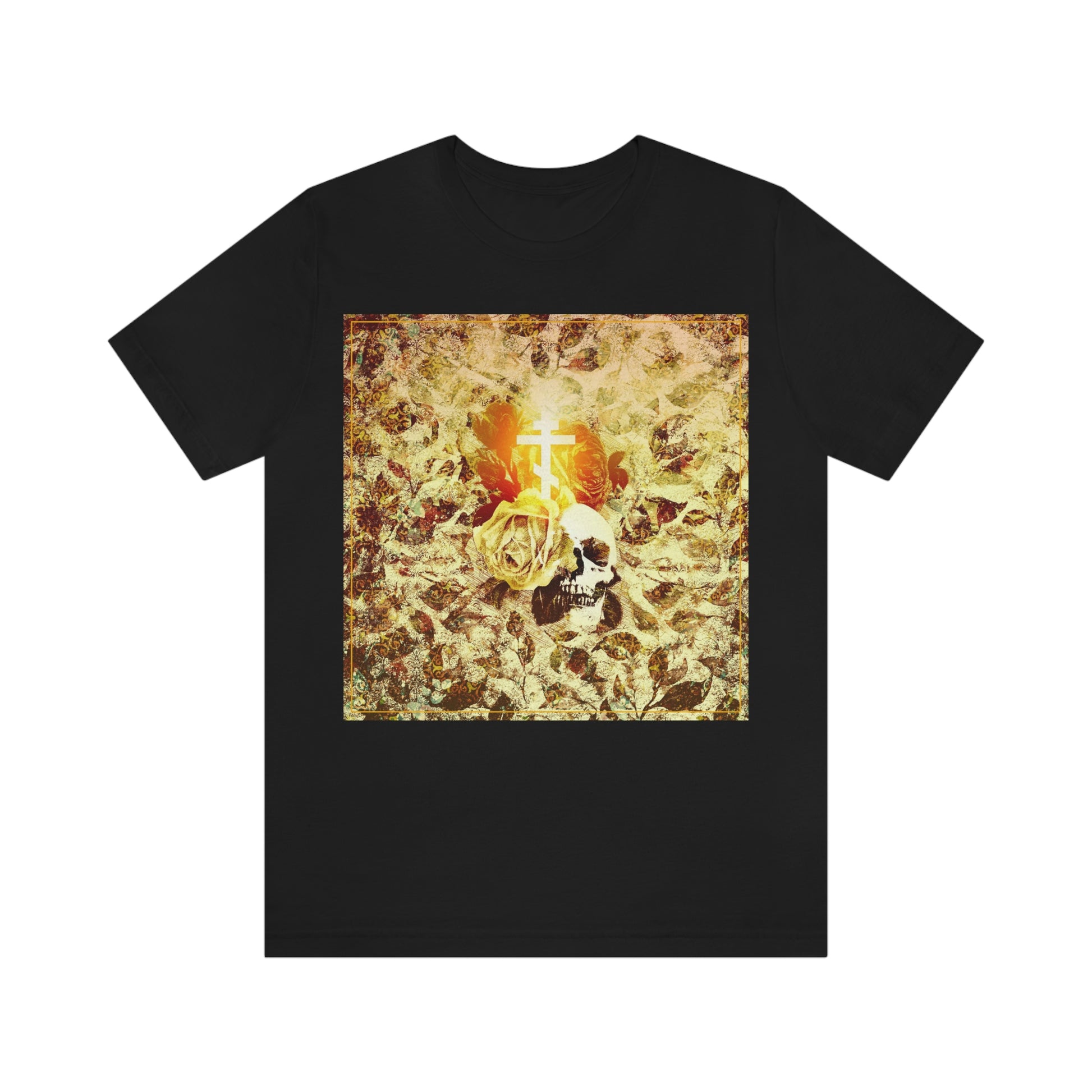 Golden Glowing Cross, Rose & Skull with Floral Texture | Gothic Style Art | Orthodox Christian T-Shirt