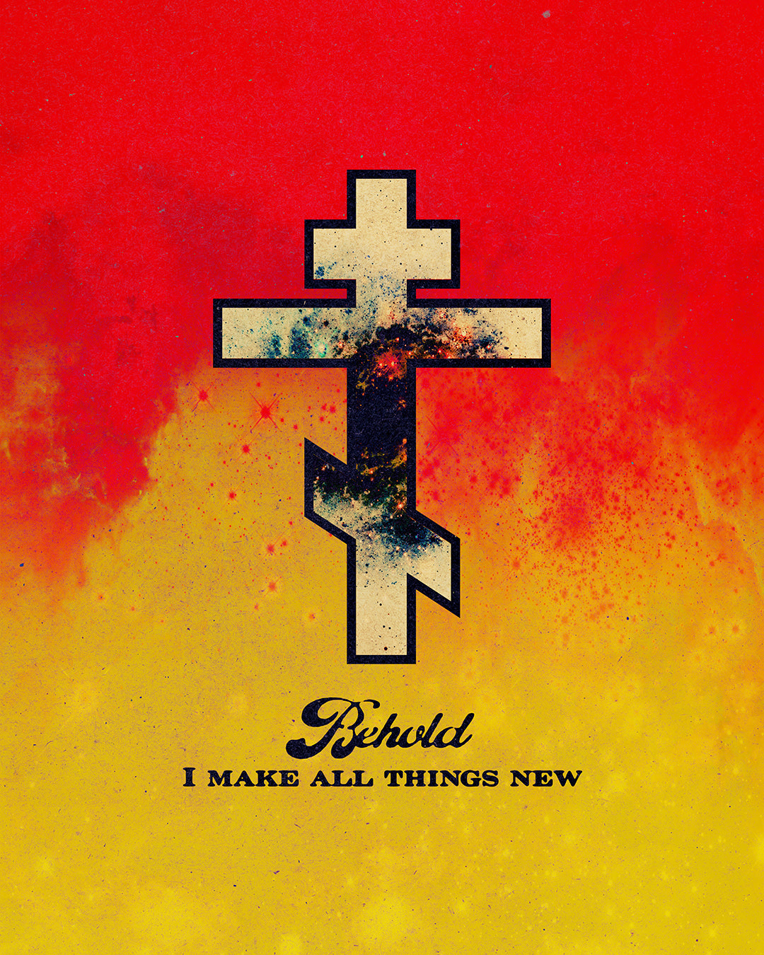 Behold, I Make All Things New (Rev 21:5) | Cosmic Orthodox Cross Red & Yellow Background | Orthodox Christian Custom Blue Denim Jacket