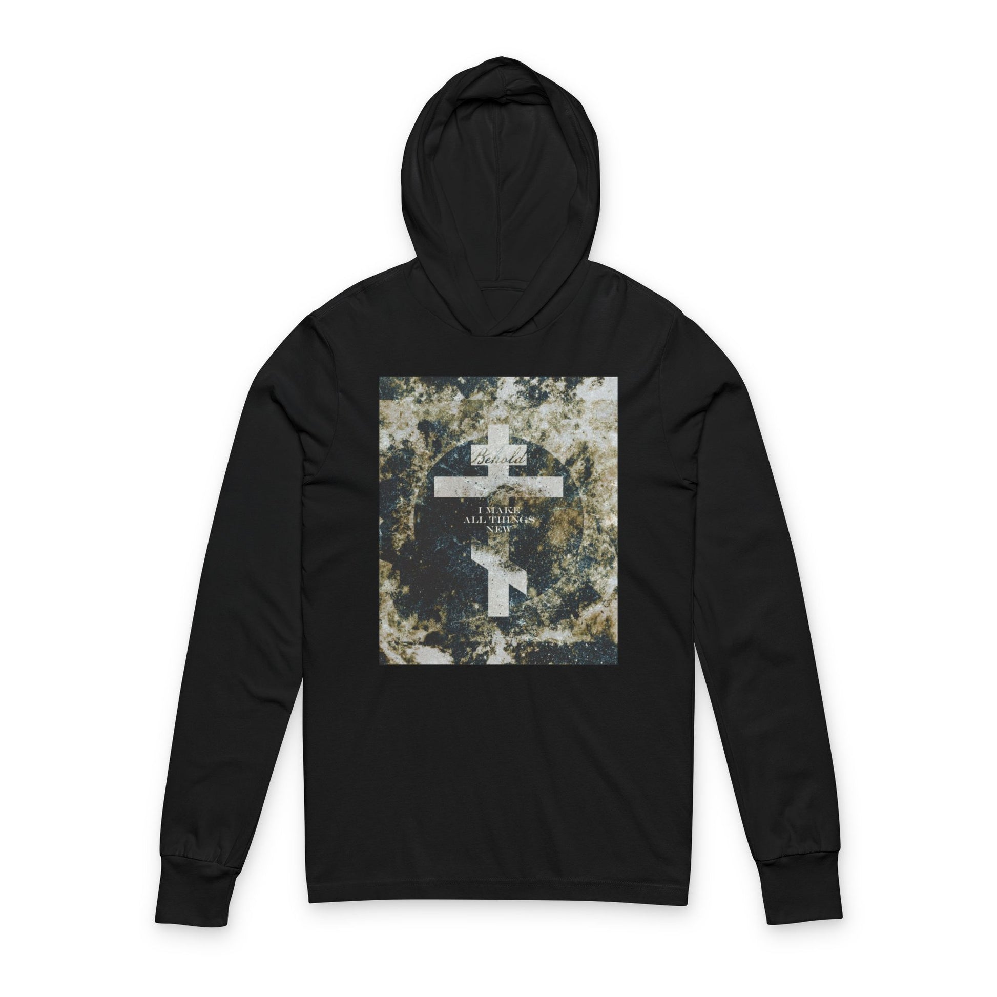 Behold, I Make All Things New | Revelation 21:5 | Cosmic Textured Orthodox Cross | Parousia | Orthodox Long Sleeve Hooded Shirt