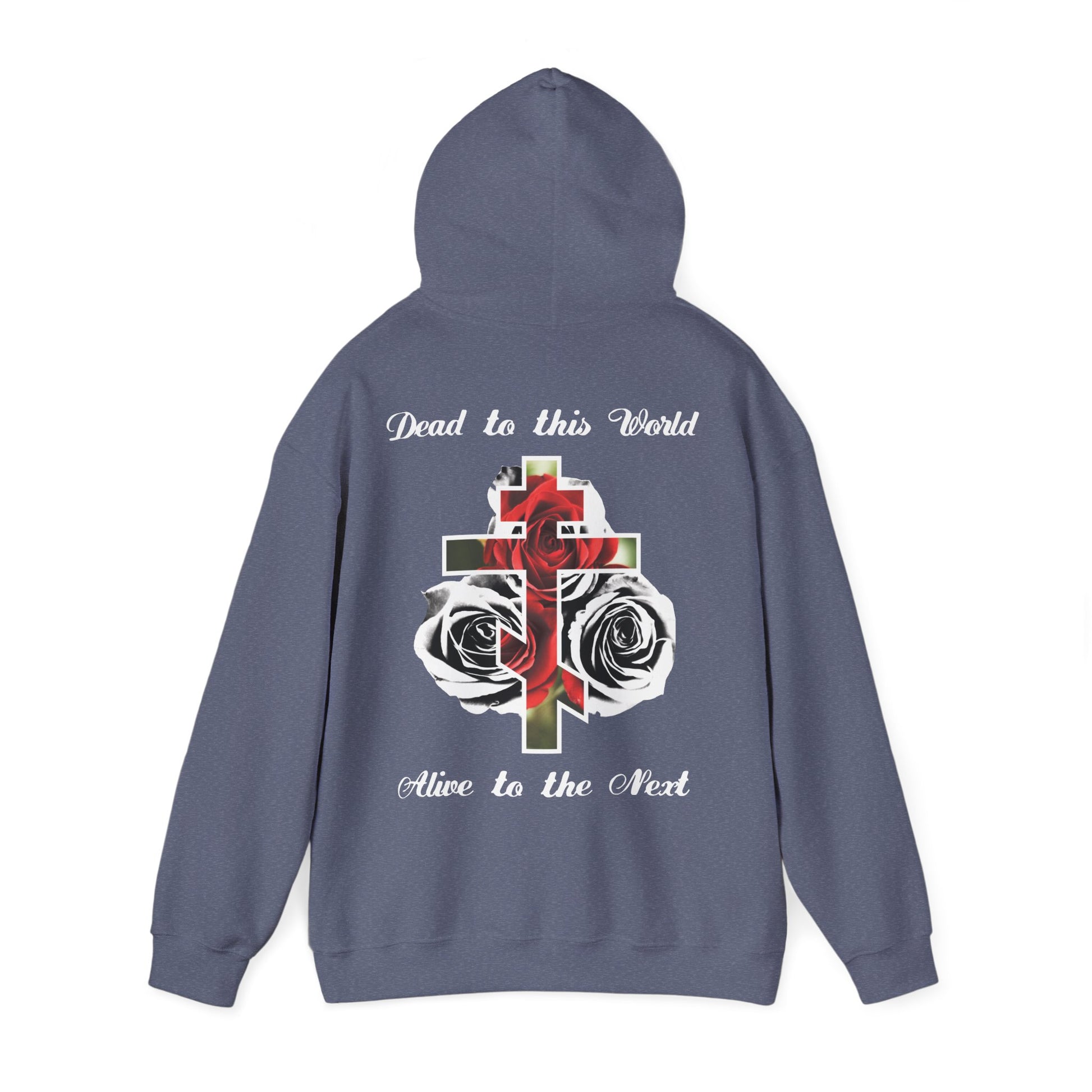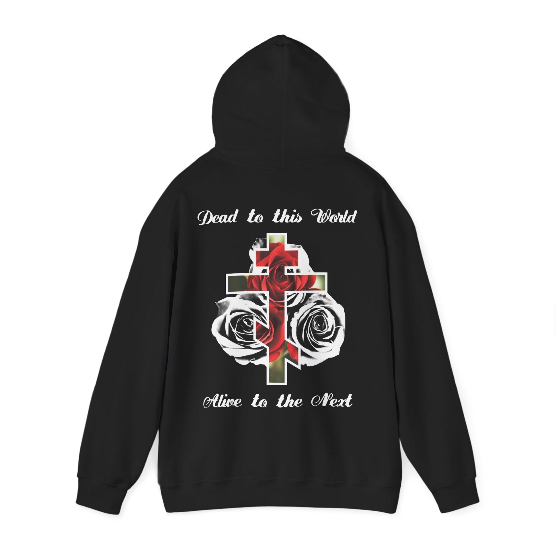 Dead to This World Alive to the Next Orthodox Cross & Gothic Rose BACK PRINT w/ Embroidered White Cross on Front Left Breast | Christian Hoodie