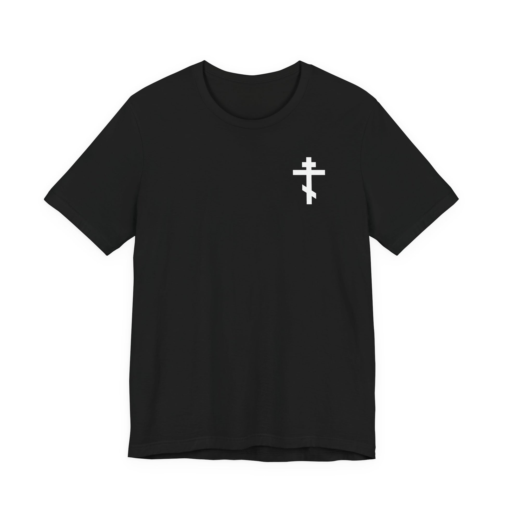 Remembrance of Death Cotton Orthodox Christian T-Shirts are streetwear for unseen warfare. Attract edifying conversation while declaring your enlistment in the Army of the God-Man Jesus Christ, Conqueror of Death and the Devil.