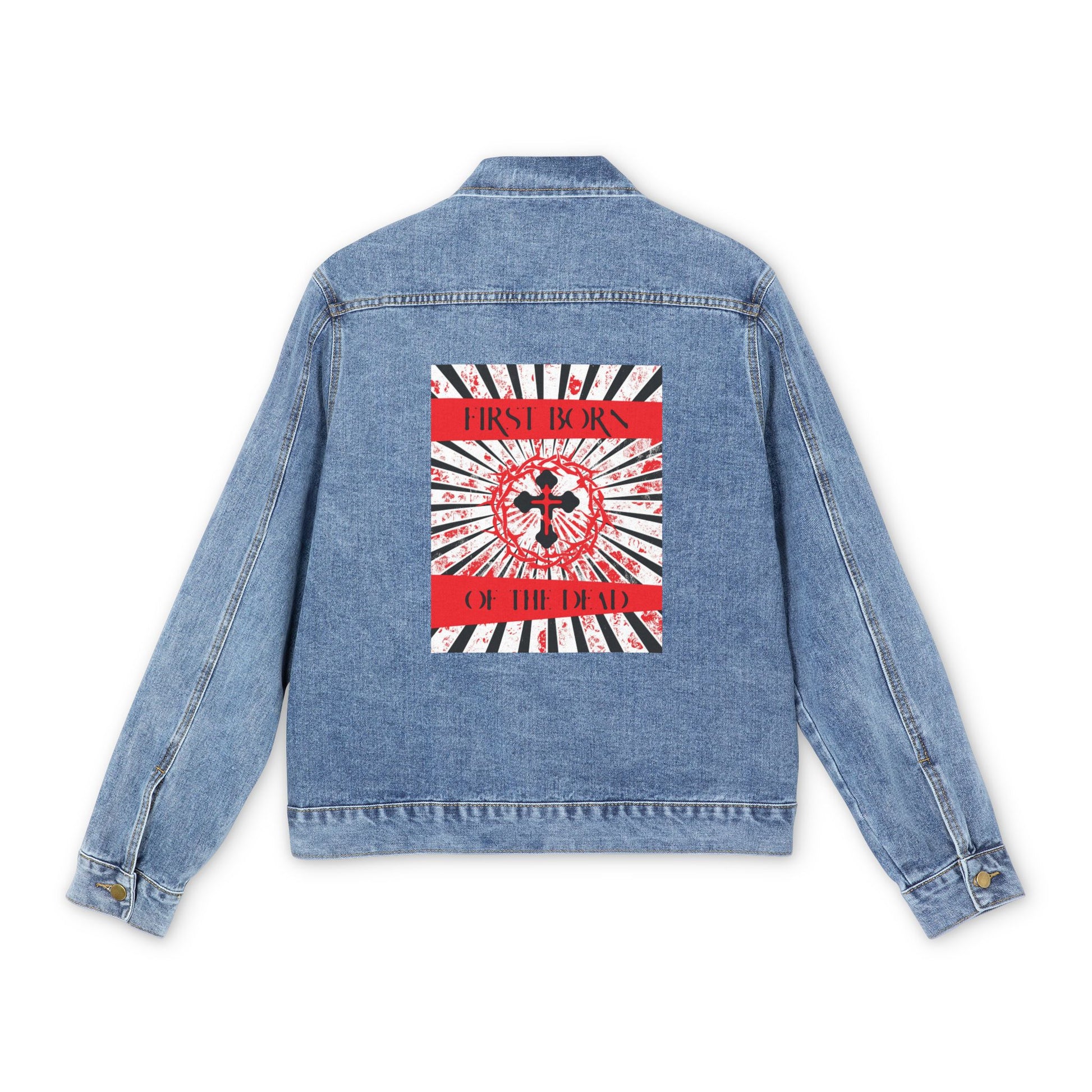 First Born of the Dead | Orthodox Cross and Crown of Thorns | Red White & Black Design with Rays | Orthodox Christian Blue Denim Jacket