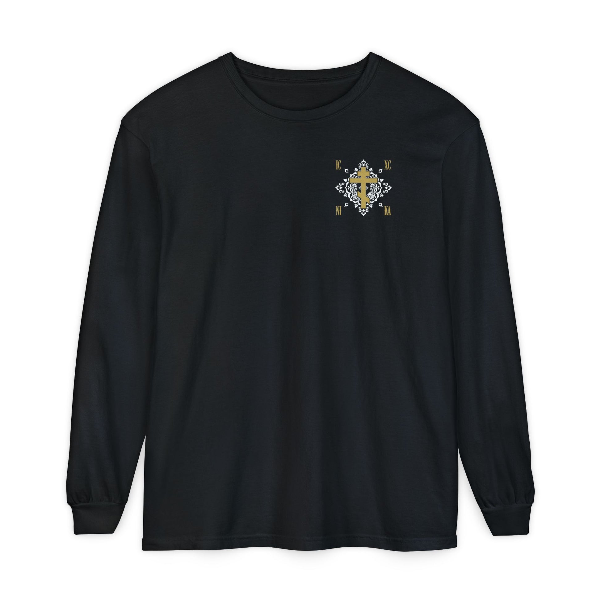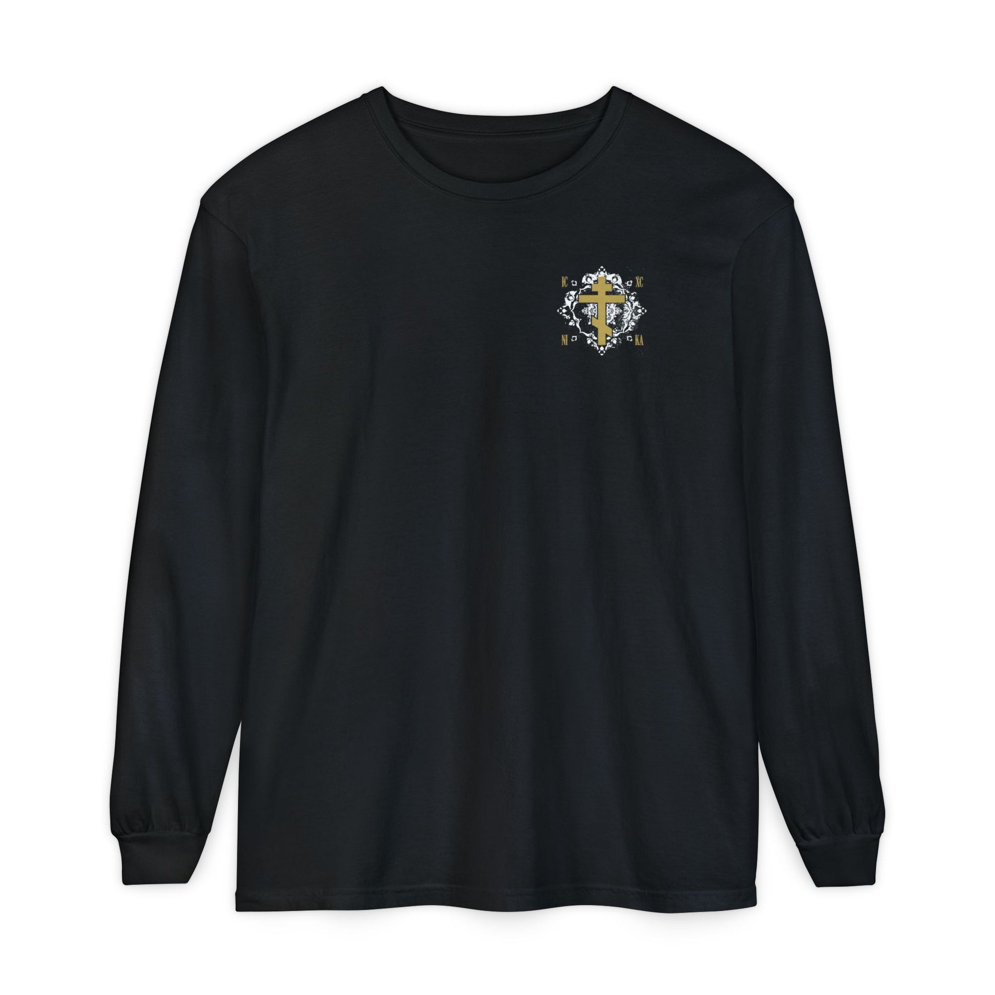 Gold Orthodox Cross ICXC NIKA (Small Design) | White Medieval Ornate Floral Pattern | Jesus Christ Conquers | Christian Long Sleeve