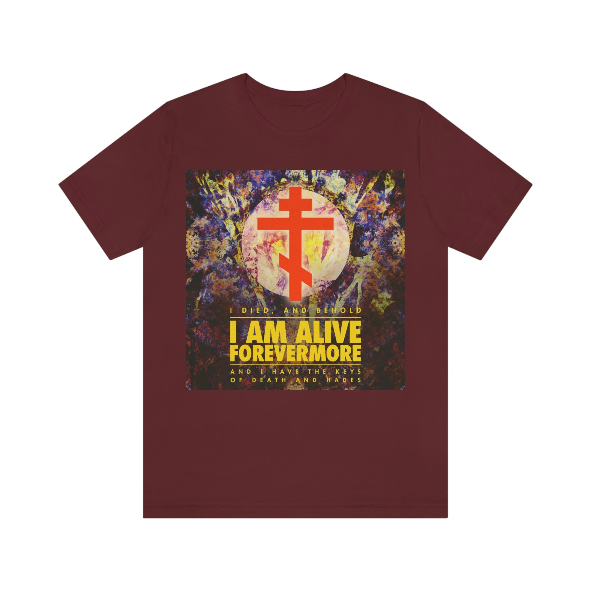 I died & behold I am alive forevermore, and I have the keys of Death and Hades (Revelation 1:18) | Red Cross on Textured Background | Orthodox Christian T-Shirt