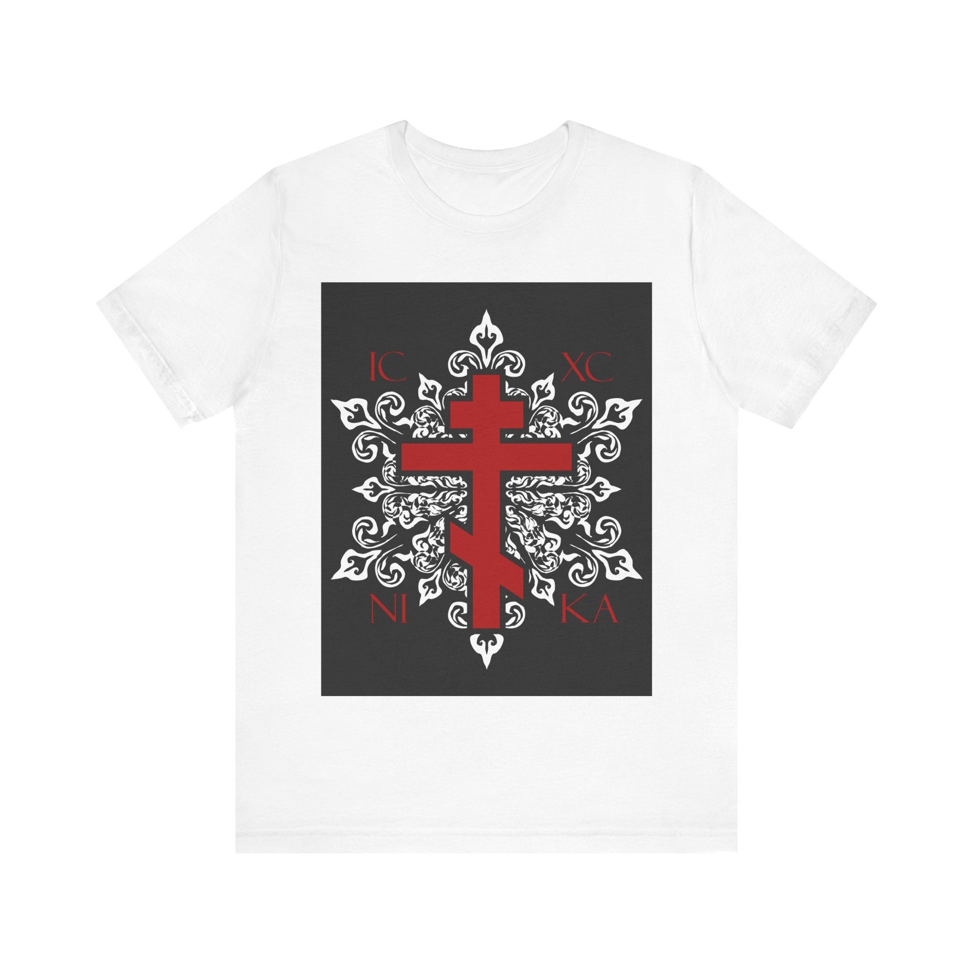 ICXC / NIKA Red Orthodox Cross on Ornate White Medieval Floral Design | Best-Selling Orthodox Christian Cotton Unisex Tee