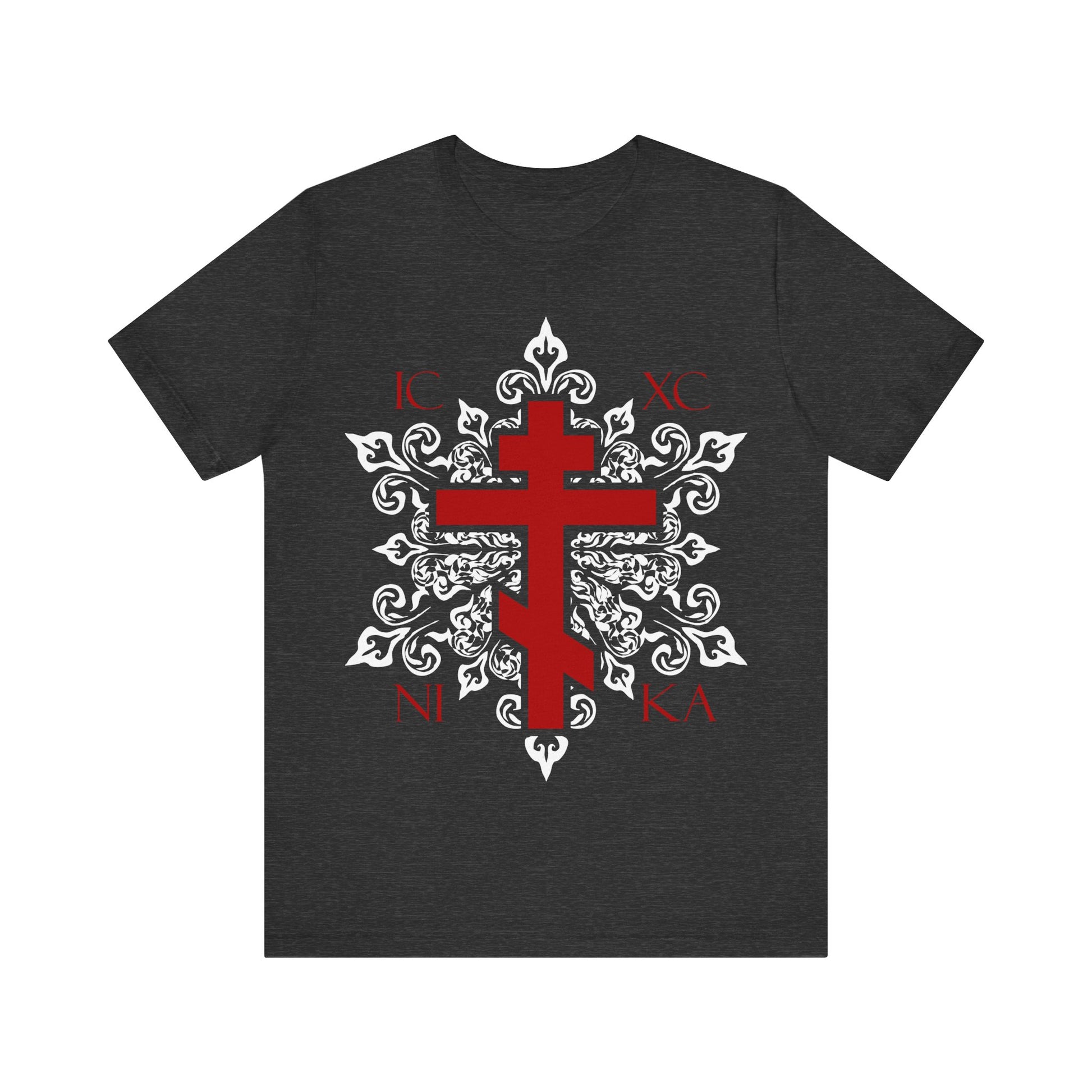 ICXC / NIKA Red Orthodox Cross on Ornate White Medieval Floral Design | Best-Selling Orthodox Christian Cotton Unisex Tee