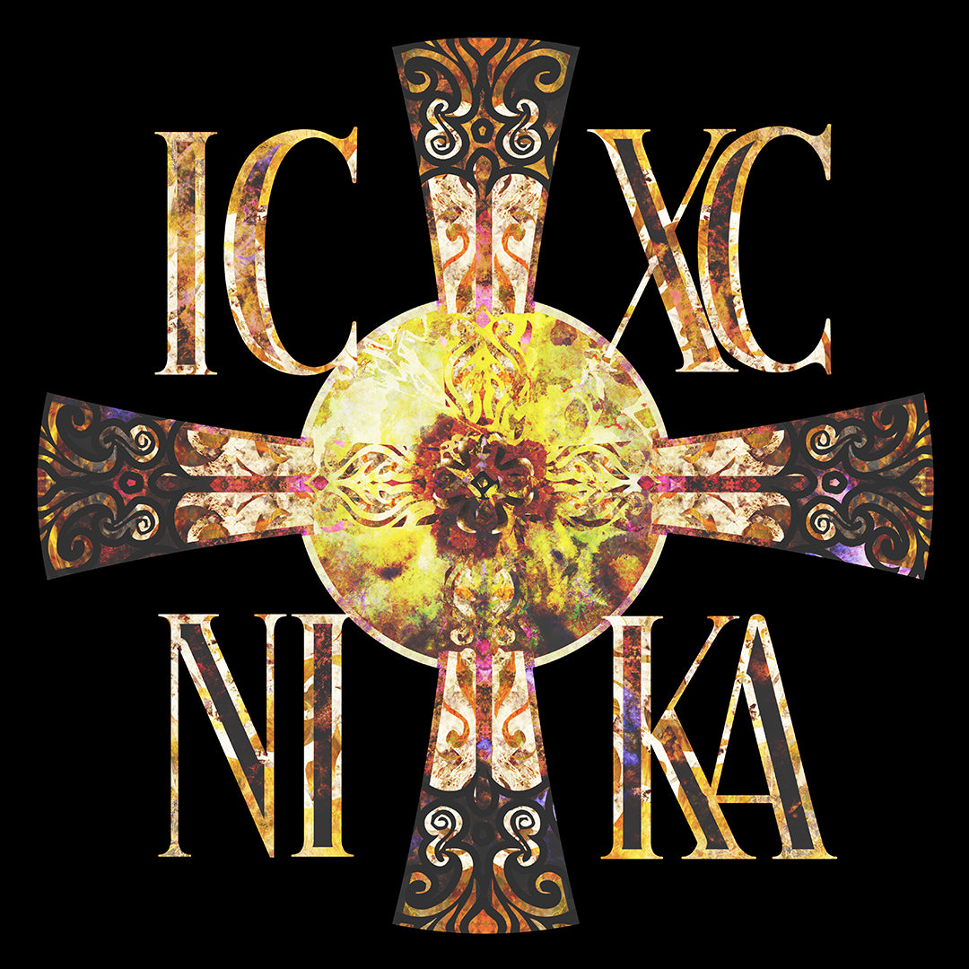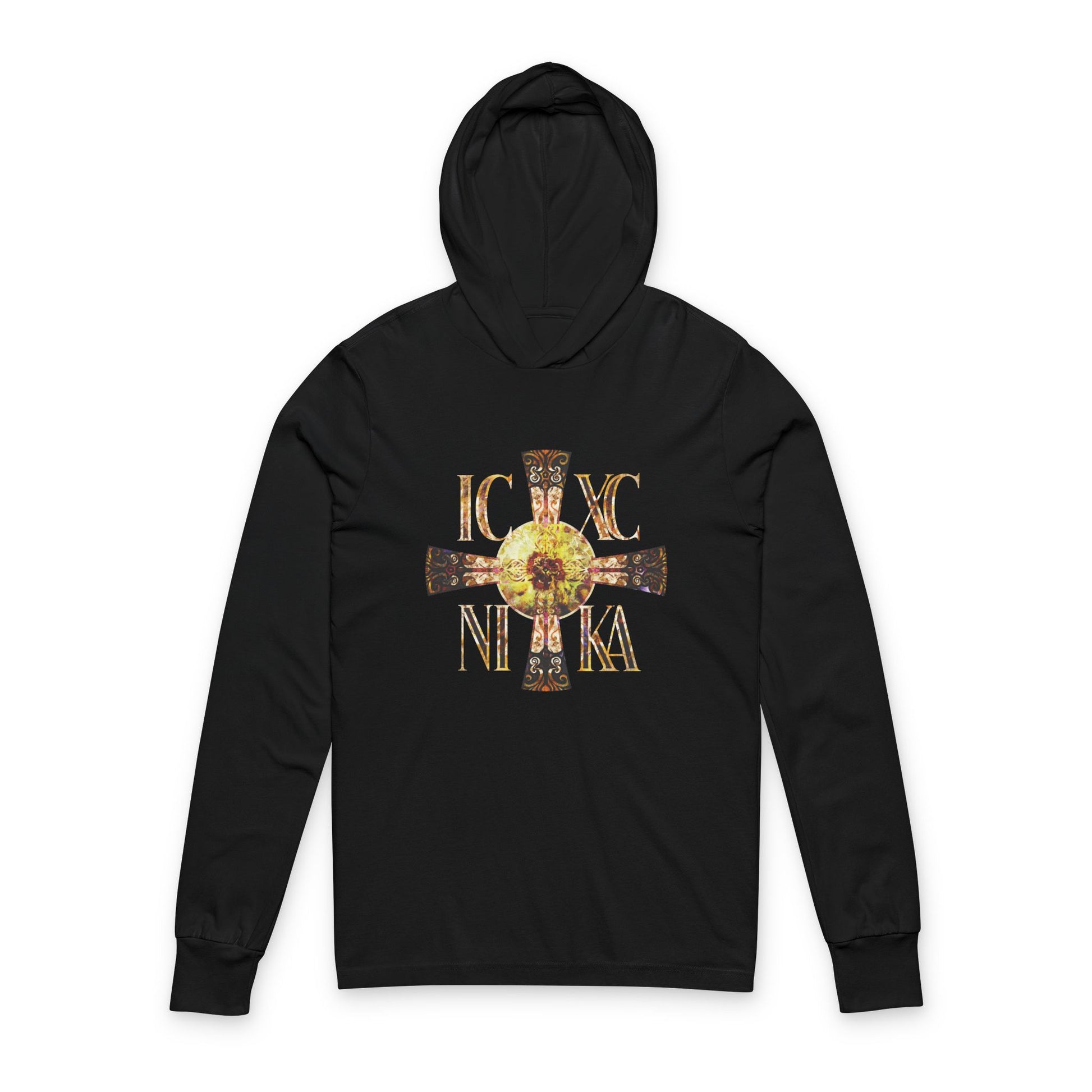 ICXC NIKA Celtic Style Equal Armed Cross | Bright Solar Texture | Orthodox Long Sleeve Hooded Shirt