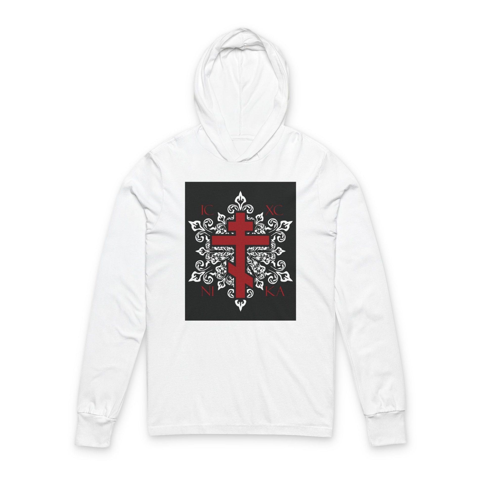 ICXC / NIKA Red Orthodox Cross on Ornate White Medieval Floral Design | Exclusive Best-Selling | Orthodox Long Sleeve Hooded Shirt