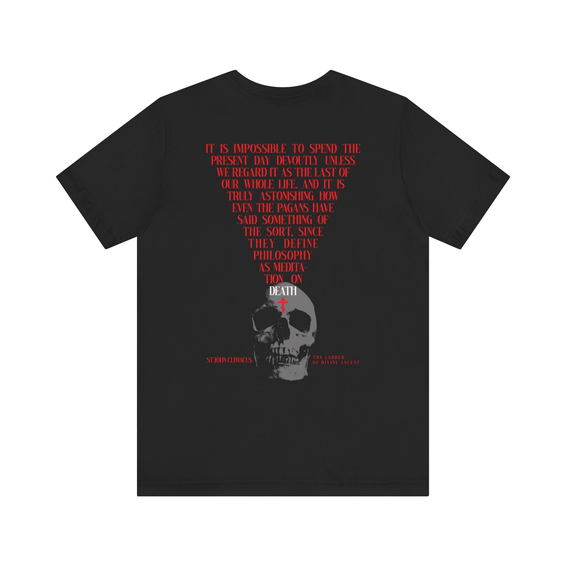 Remembrance of Death Cotton Orthodox Christian T-Shirts are streetwear for unseen warfare. Attract edifying conversation while declaring your enlistment in the Army of the God-Man Jesus Christ, Conqueror of Death and the Devil.