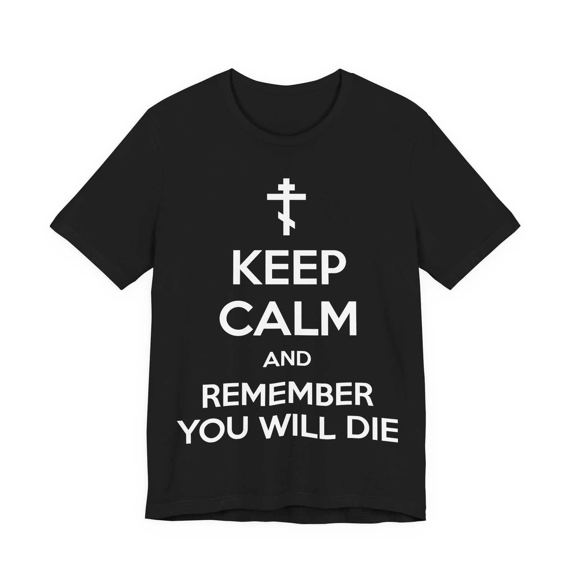 Keep Calm and Remember You Will Die | Orthodox Cross | Ascetic Ethos | Memento Mori Meme | Christian Cotton (and Heather Blend) Unisex Tee