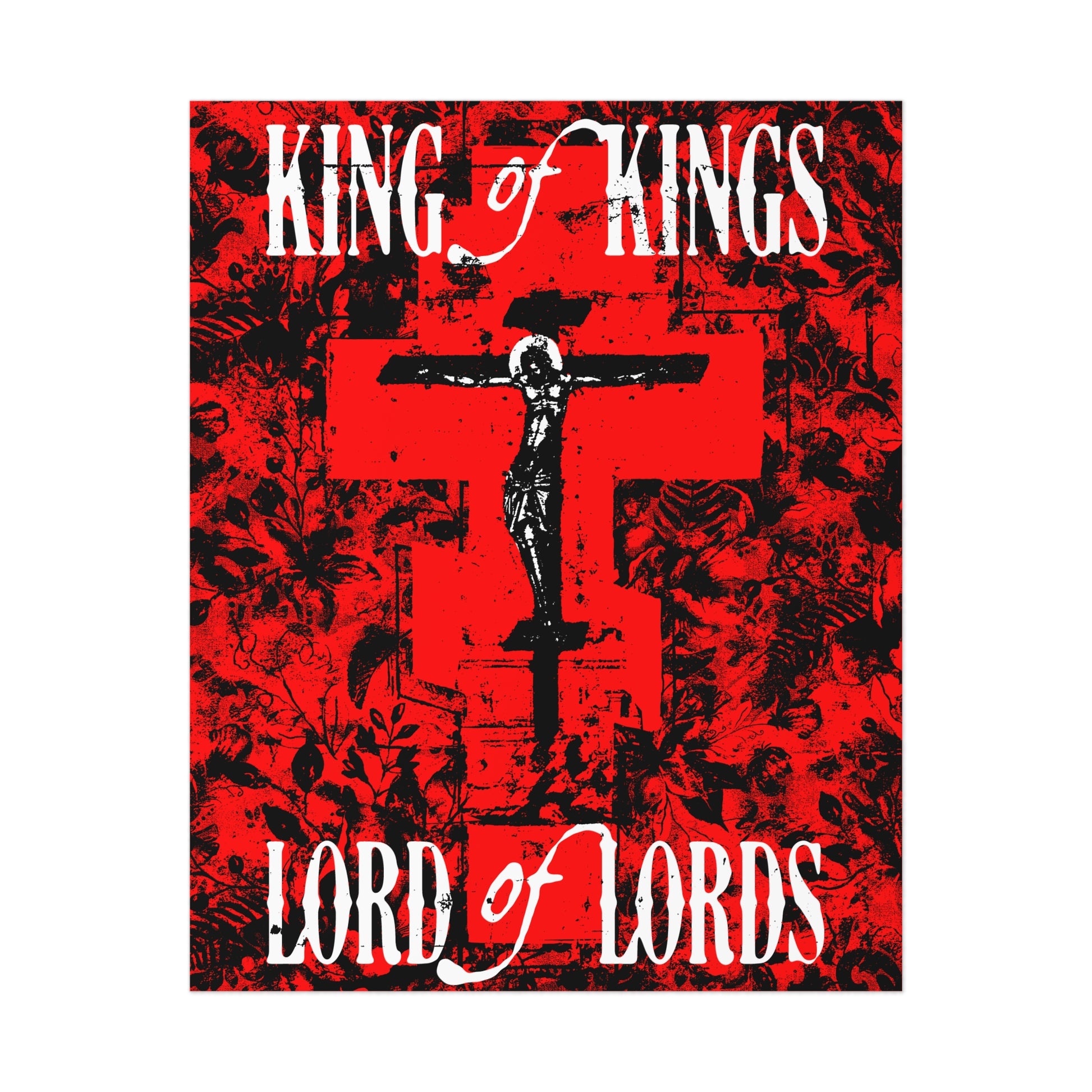 King of Kings, Lord of Lords | Christ Crucified Icono-Graphic | Red Cross Nature Texture w/ White Text | Christian Art Poster