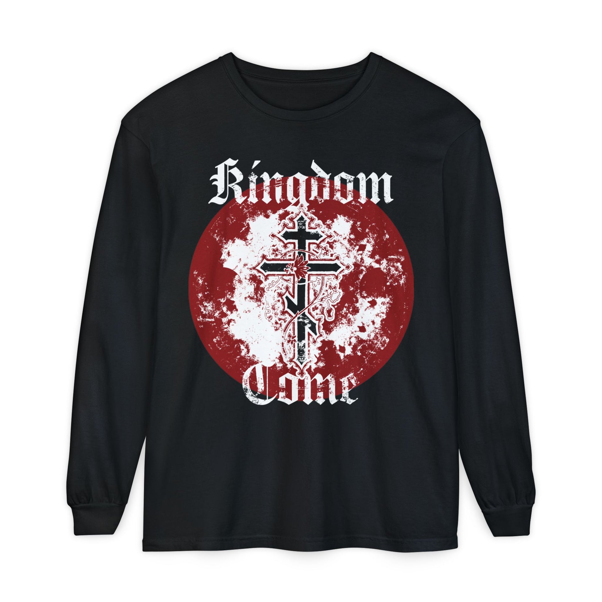 Kingdom Come | Lord's Prayer | Orthodox Cross with Vine | Textured Gothic Font | Orthodox Long Sleeve Cotton Shirt