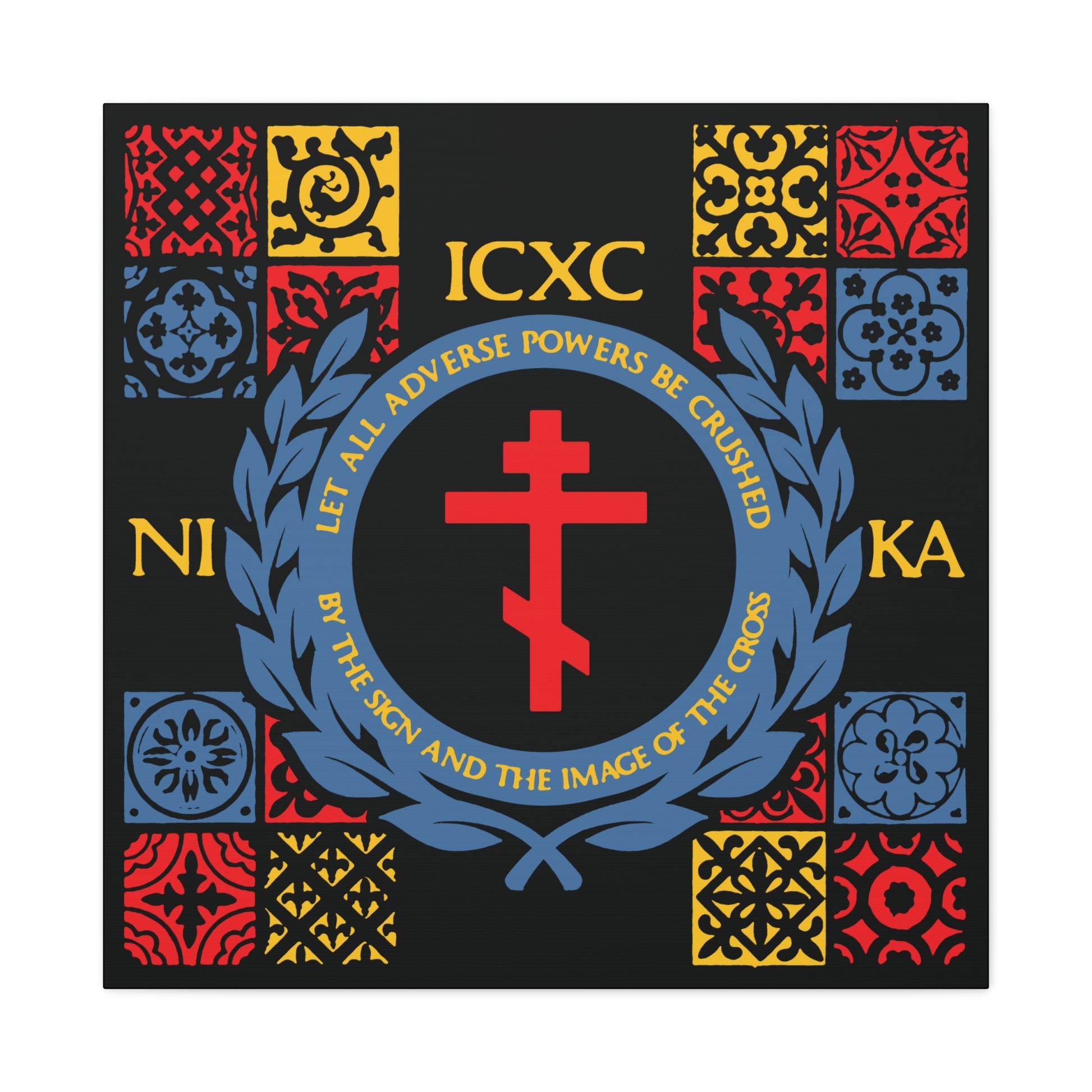 Let All Adverse Powers Be Crushed (Red, Yellow & Blue Design) | ICXC NIKA | Medieval Tile Design | Orthodox Christian Canvas Art
