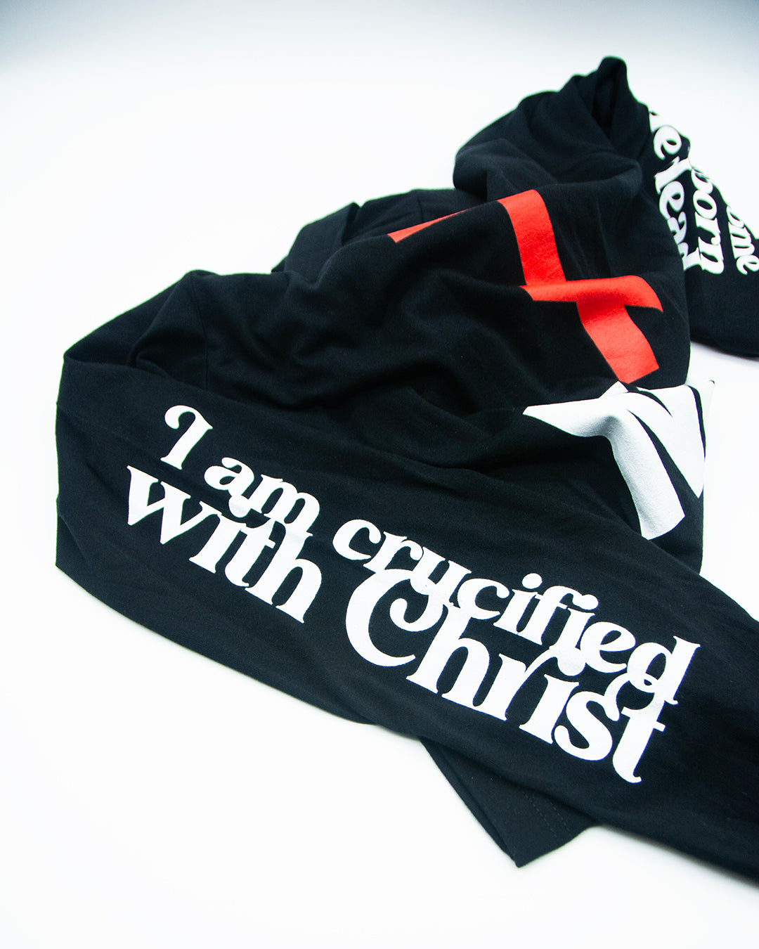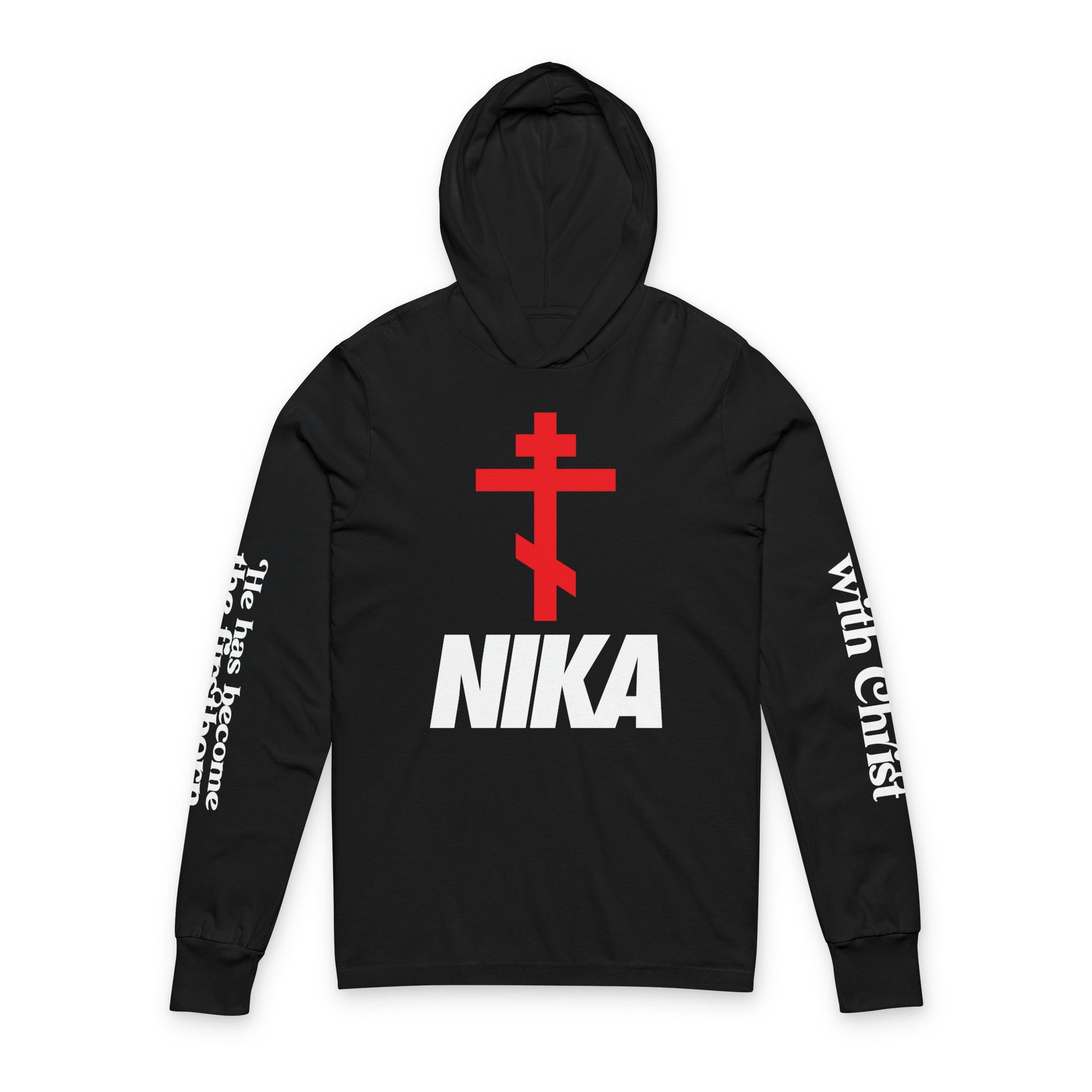NIKA Orthodox Cross NIKE Logo Mashup | Crucified With Christ | Firstborn of the Dead | Sleeve Prints | Orthodox Long Sleeve Hooded Shirt