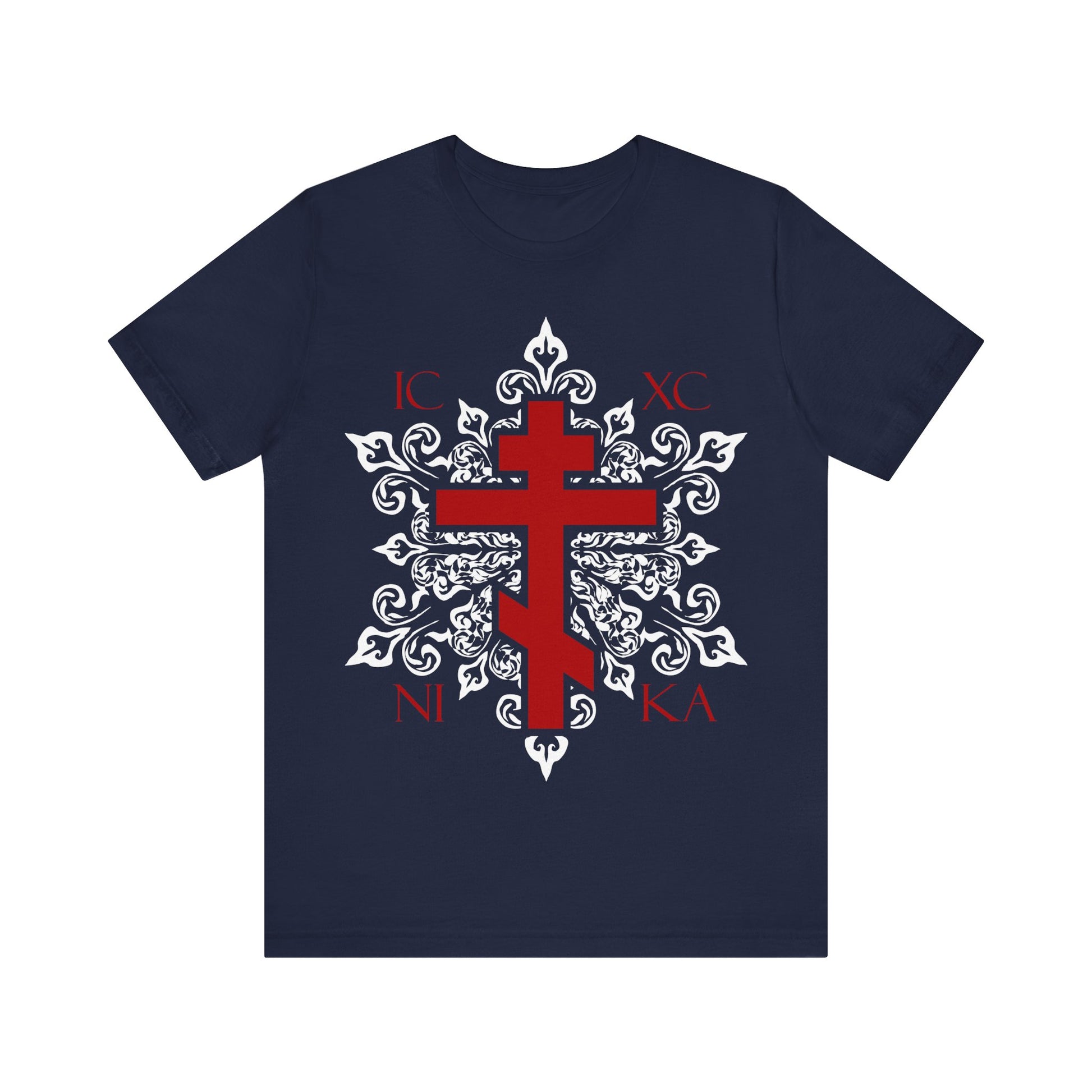 ICXC / NIKA Red Orthodox Cross on Ornate White Medieval Floral Design | Exclusive Best-Selling Orthodox Christian T-Shirt