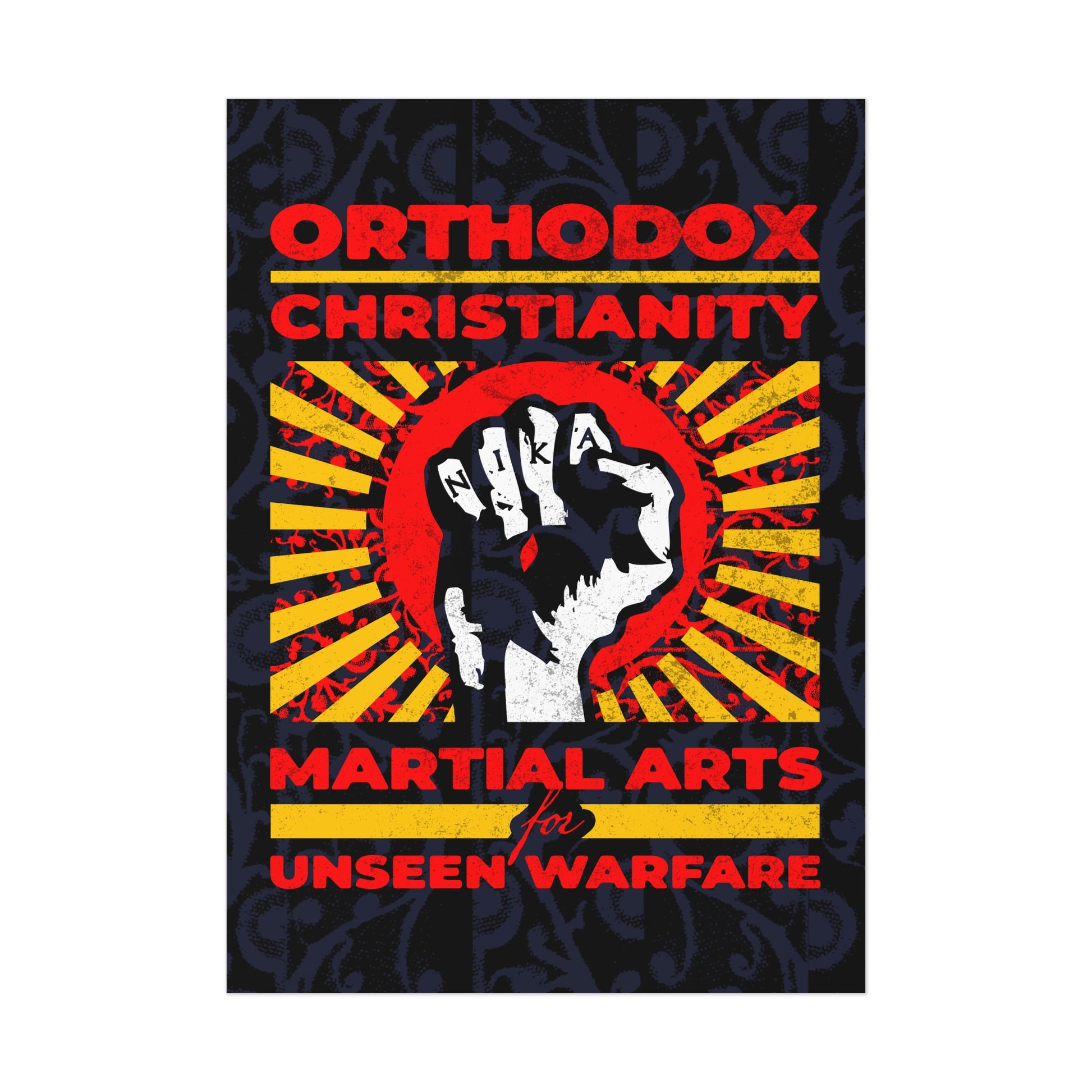 Orthodox Christianity: Martial Arts for Unseen Warfare | NIKA Jesus Fist on Colorful Sunburst Design | Orthodox Christian Art Poster