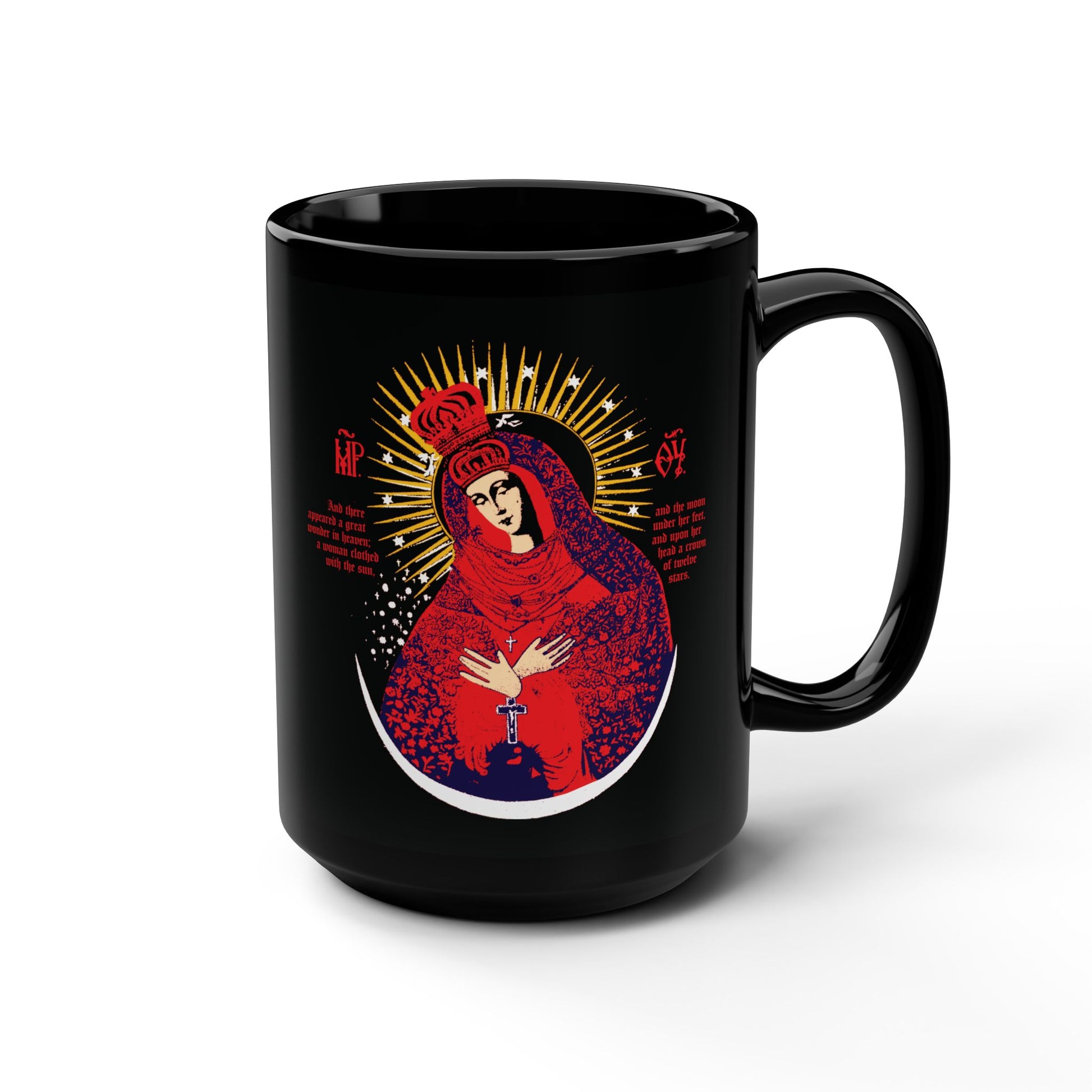 Our Lady the Gate of Dawn Icono-Graphic | Theotokos Crowned | Woman of the Apocalypse | Red Blue & Gold Design | Orthodox Christian Black Mug