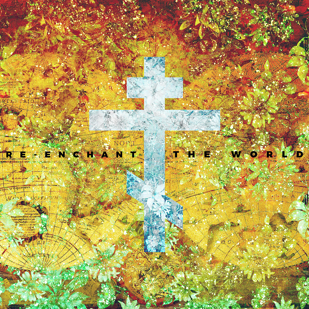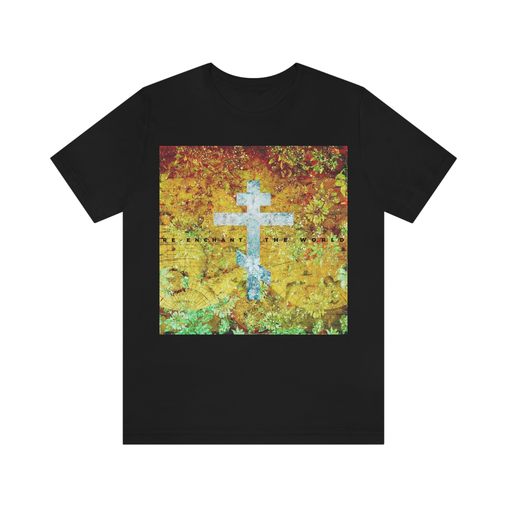 Re-Enchant the World | Light Blue Orthodox Cross Overlaid on World Map with Floral Texture | Orthodox Christian T-Shirt