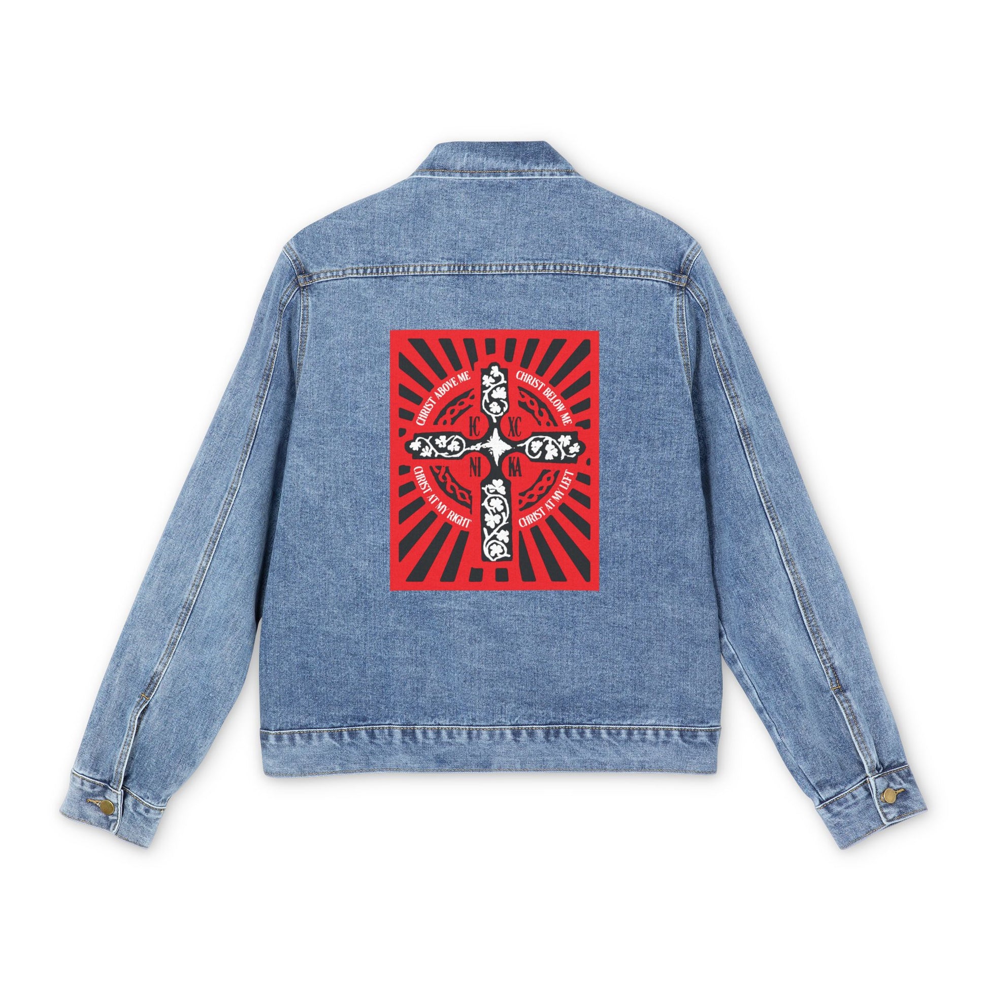 Red ICXC NIKA Enniskillen Celtic Cross | Lorica of St. Patrick | Shield Prayer | Orthodox Christian Blue Denim Jacket