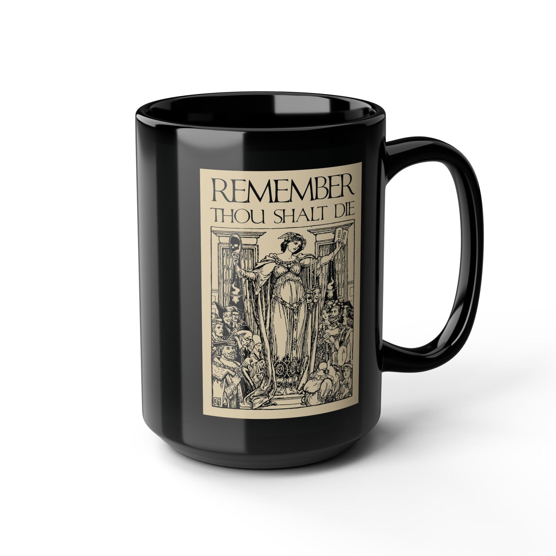 Remember You Will Die Shakespearean Design | Memento Mori | Classic Woodcut Illustration Aesthetic | Orthodox Christian Black Mug