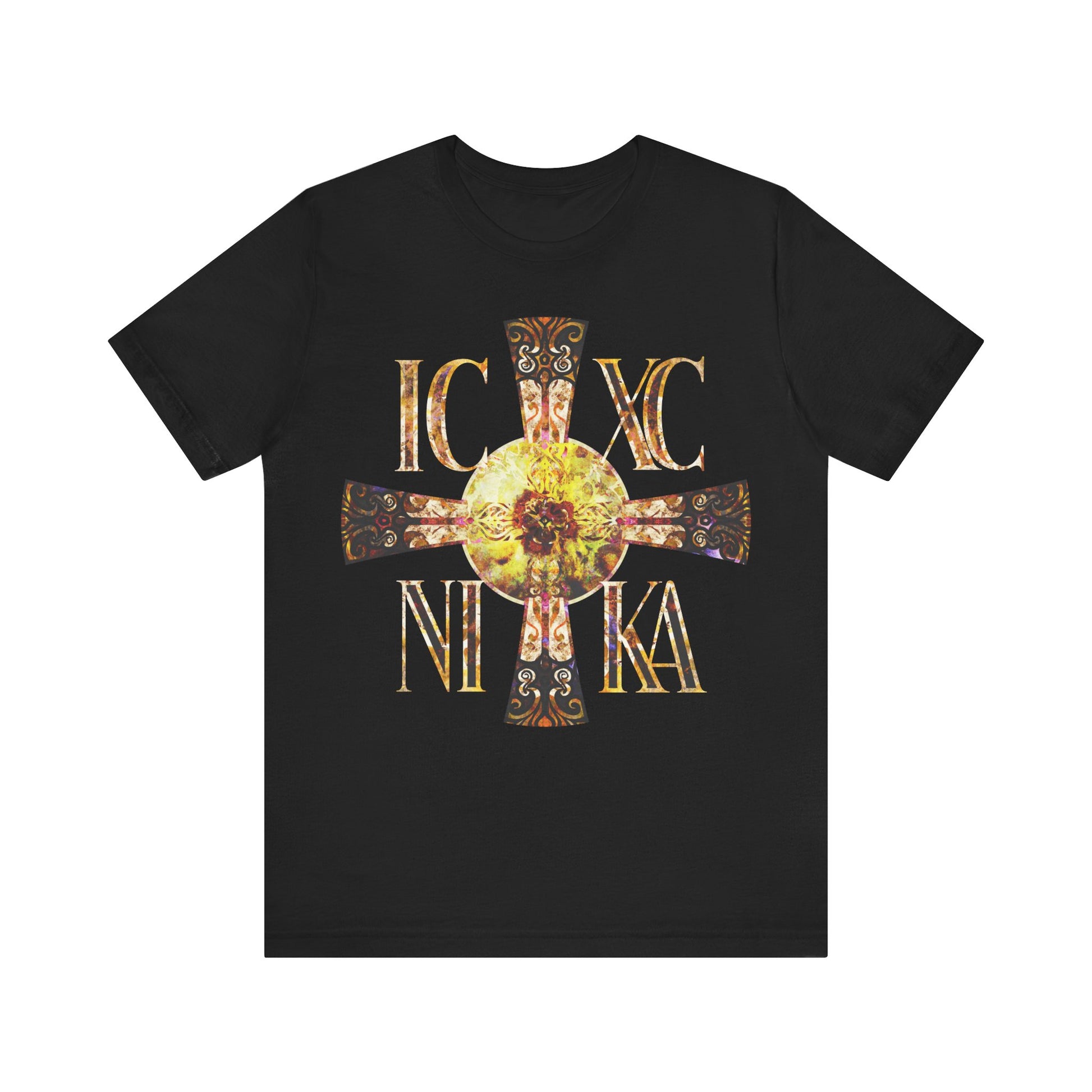 ICXC NIKA Celtic Style Equal Armed Cross | Bright Solar Texture | Orthodox Christian T-Shirt