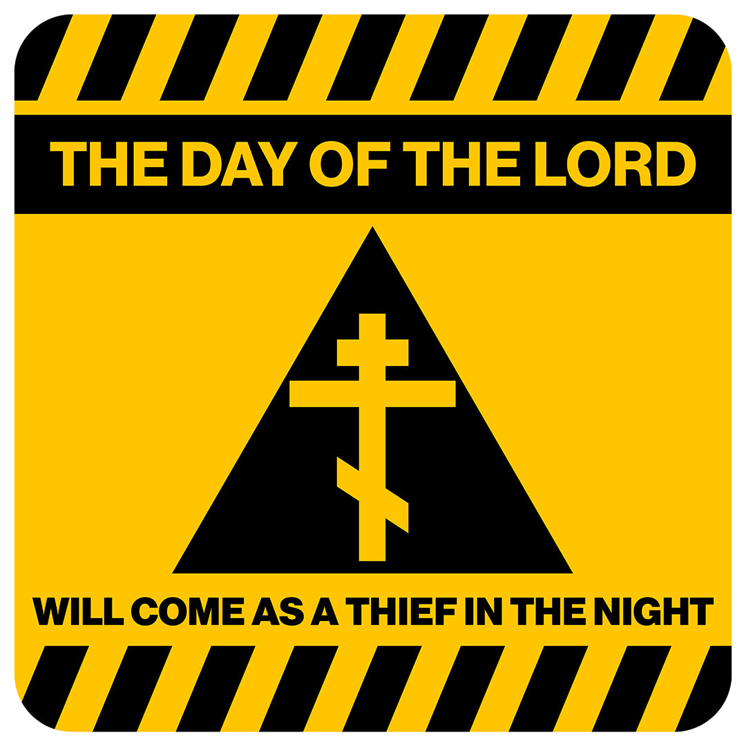 The Day of the Lord Will Come as a Thief in the Night (2 Peter 3:10) | Yellow Caution Street Sign Design with Russian Cross | Orthodox Christian T-Shirt