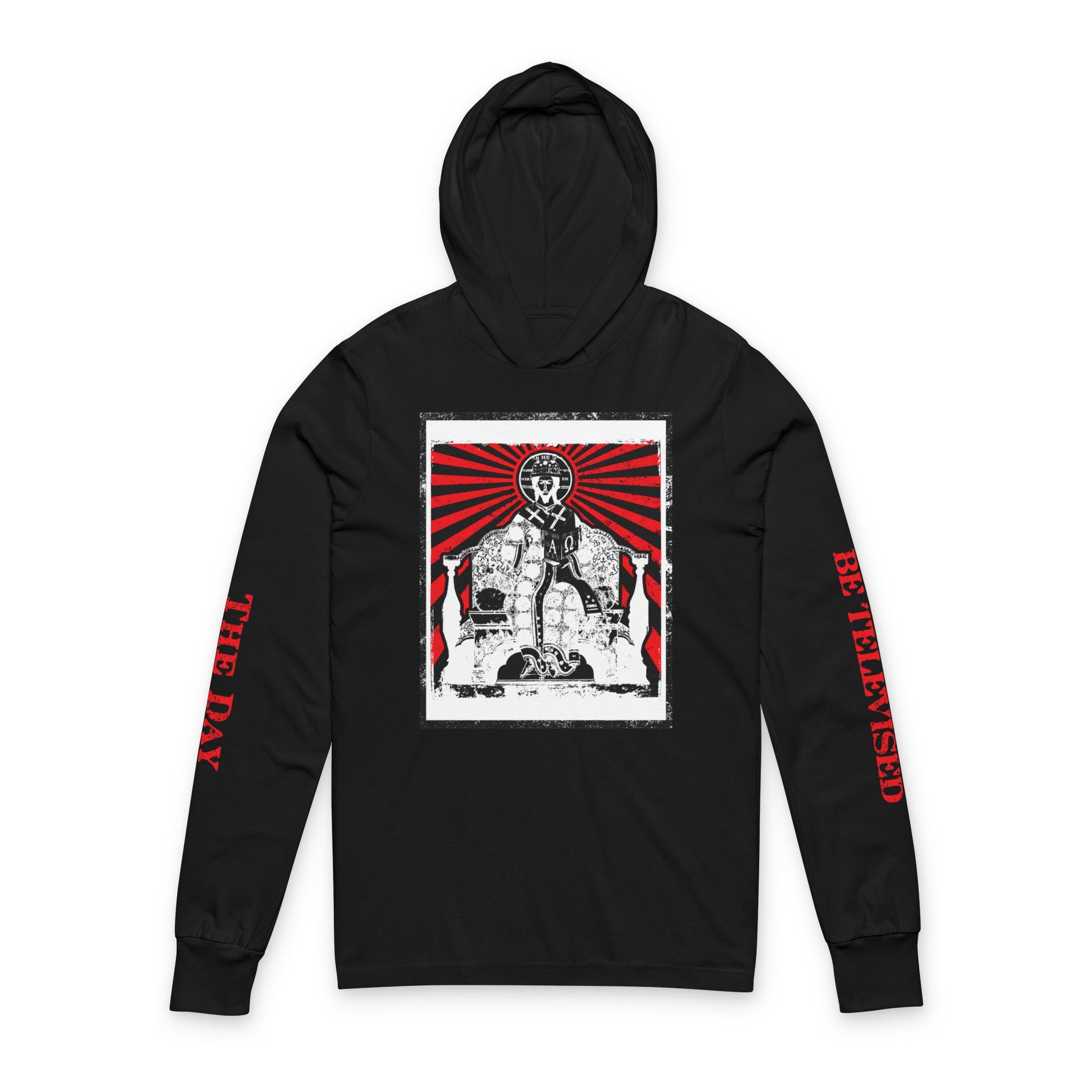 The Day of the Lord Shall Not Be Televised | Jesus Christ Iconographic with Sleeve Text | Revelation | Orthodox Long Sleeve Hooded Shirt