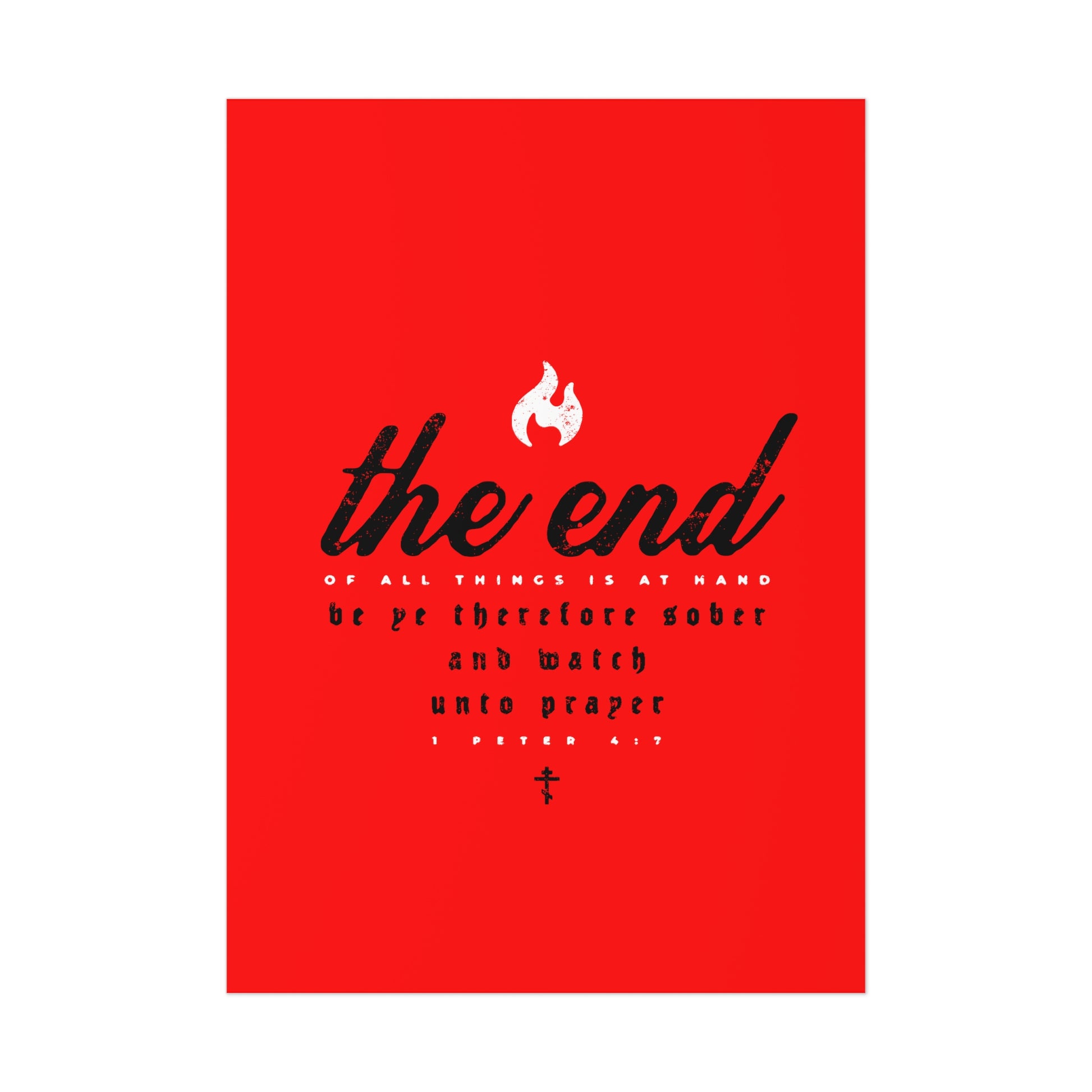 The End of All Things is At Hand (1 Peter 4:7) | Minimalist Typography | White and Black on Red Background | Orthodox Christian Art Poster