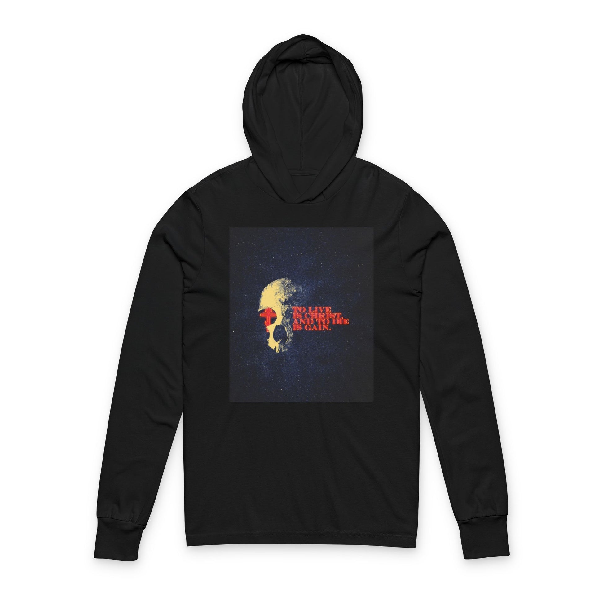 To Live is Christ and to Die is Gain | Phil 1:21 | Retro Texture | Glowing Letters and Cross with Skull | Orthodox Long Sleeve Hooded Shirt