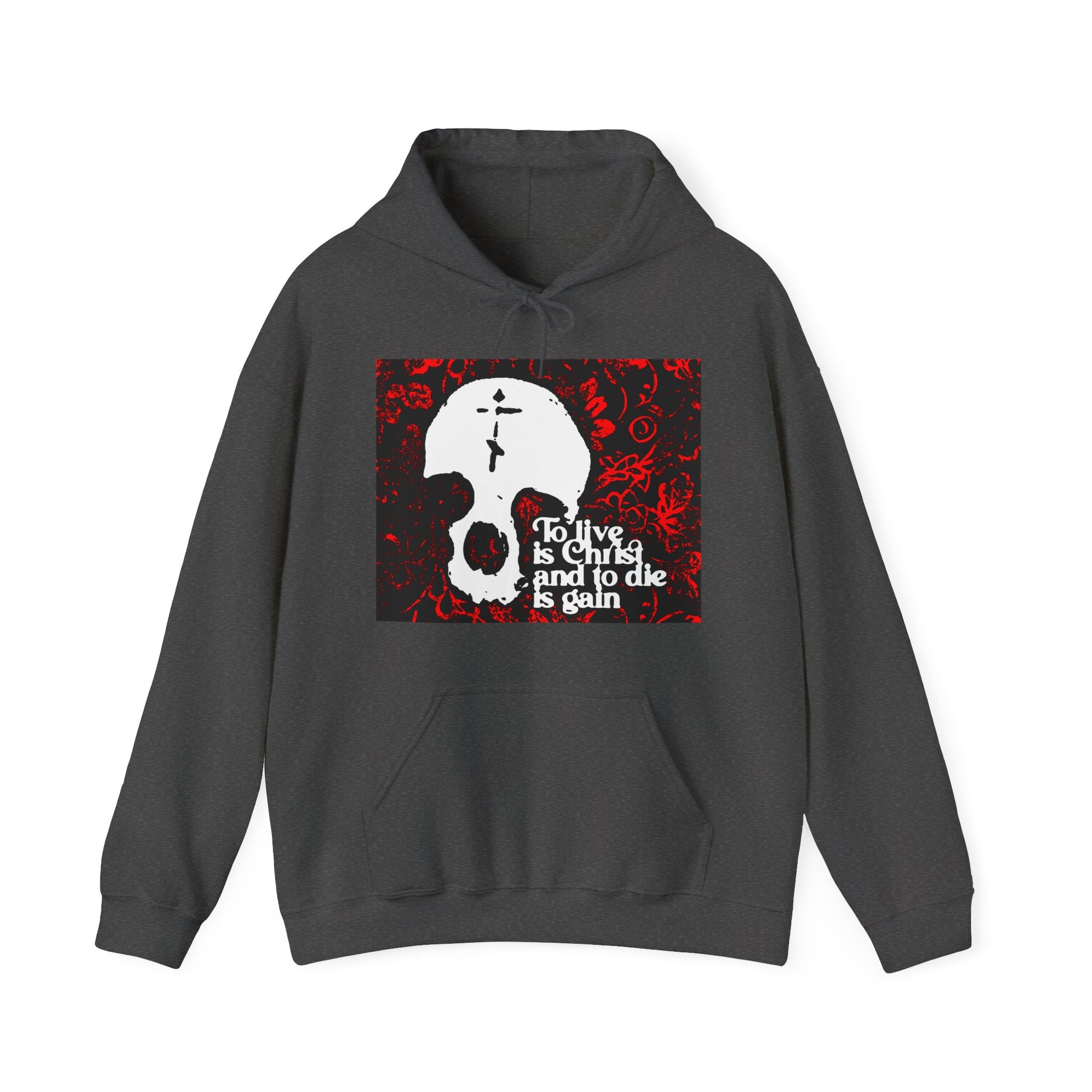 To Live is Christ To Die is Gain (Phil 1:21) | Skull with Cross on Red Floral Texture | Orthodox Christian Hoodie / Hooded Sweatshirt