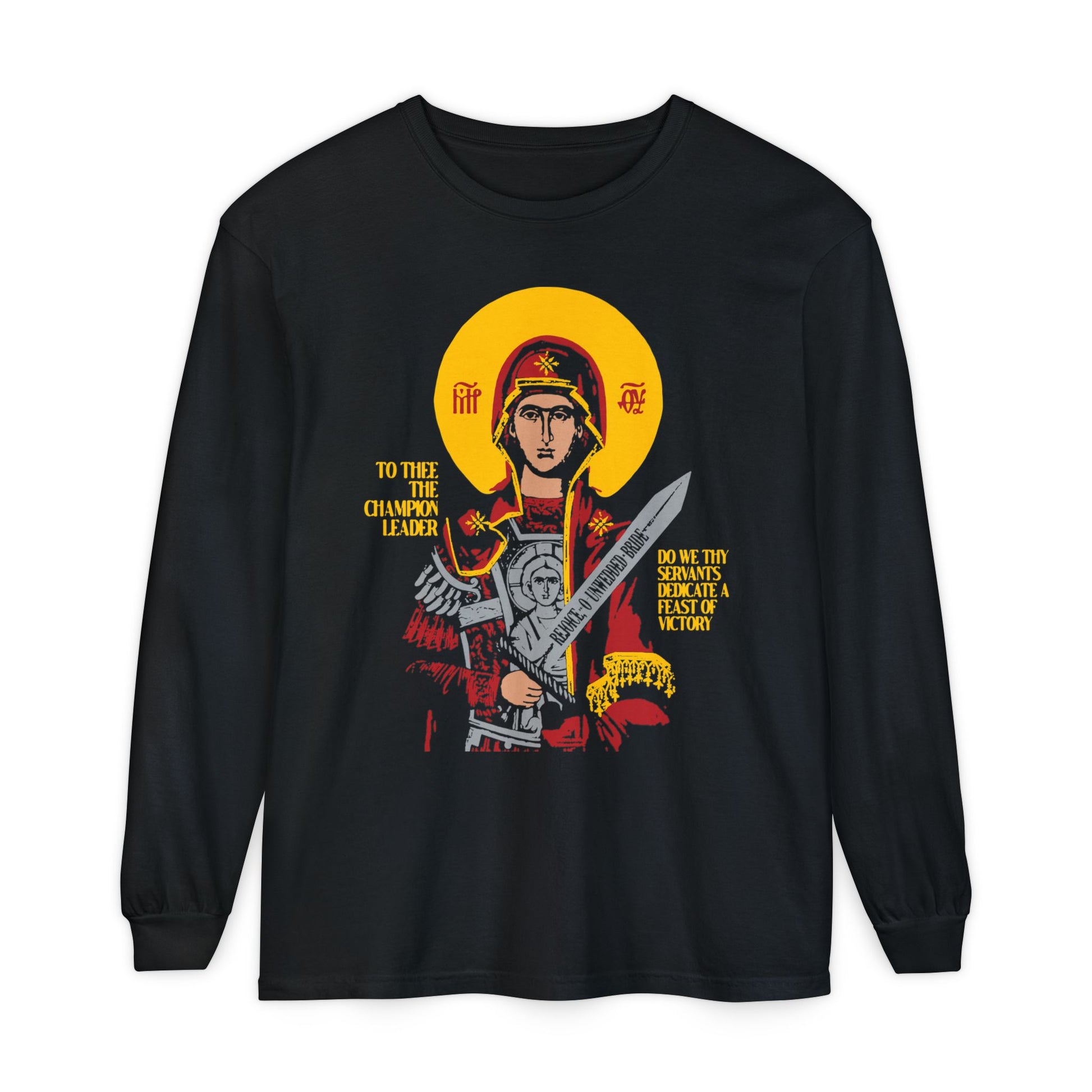 To Thee the Champion Leader | Mother of God | Theotokos with Sword IconoGraphic | Orthodox Christian Long Sleeve Shirt