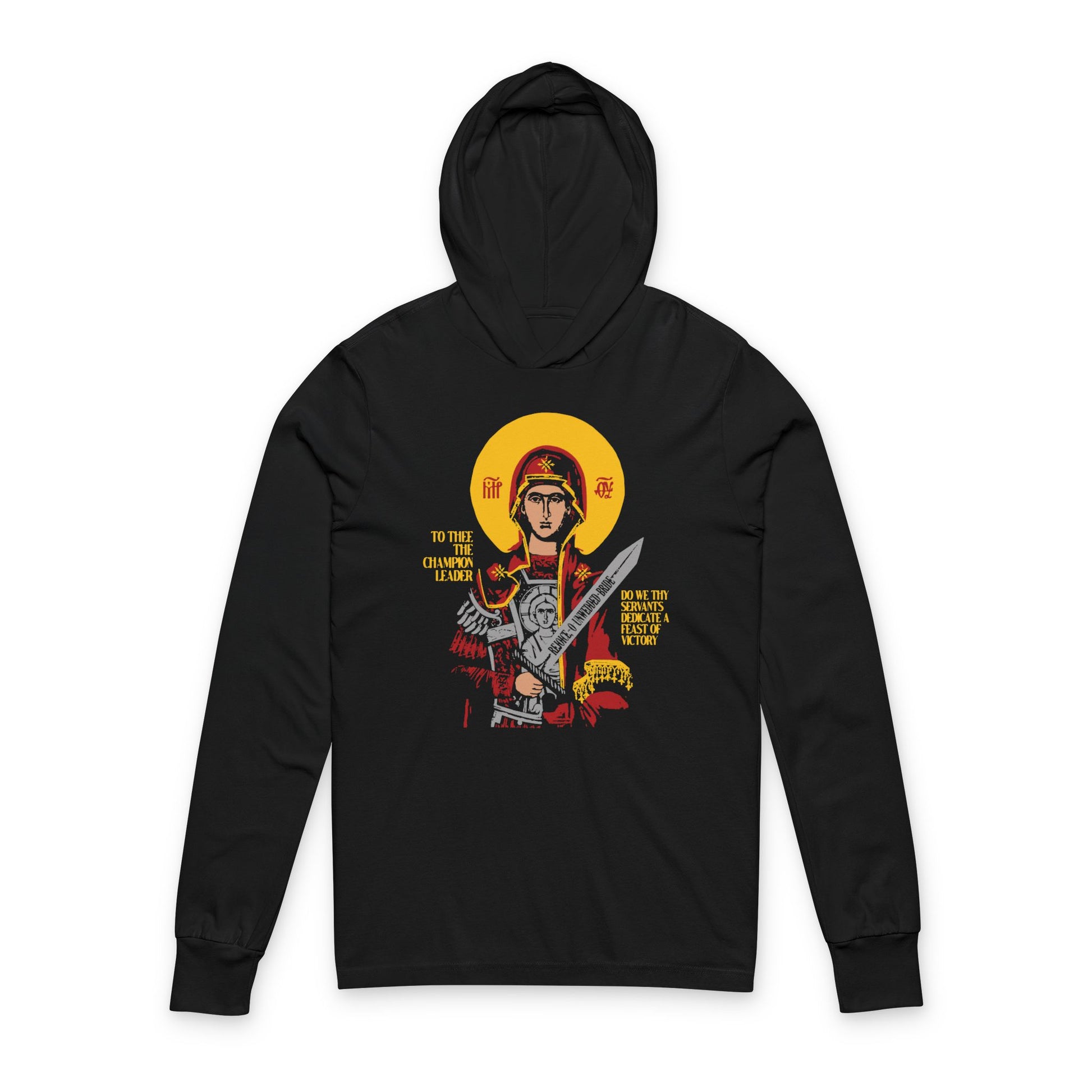 To Thee the Champion Leader | Mother of God | Theotokos with Sword IconoGraphic | Orthodox Long Sleeve Hooded Shirt