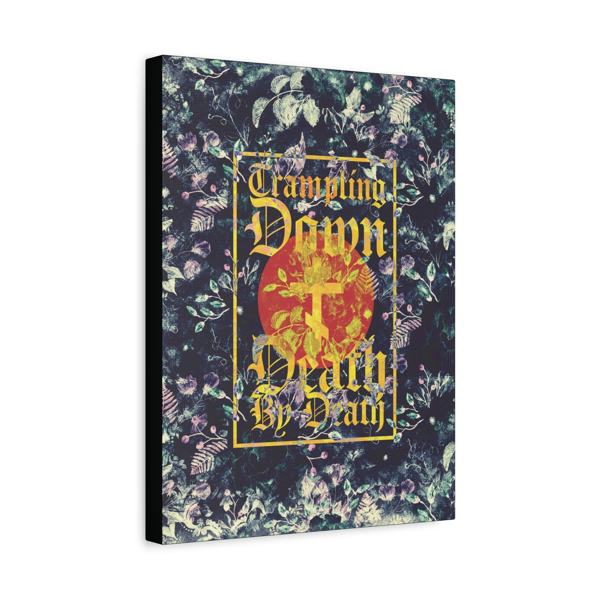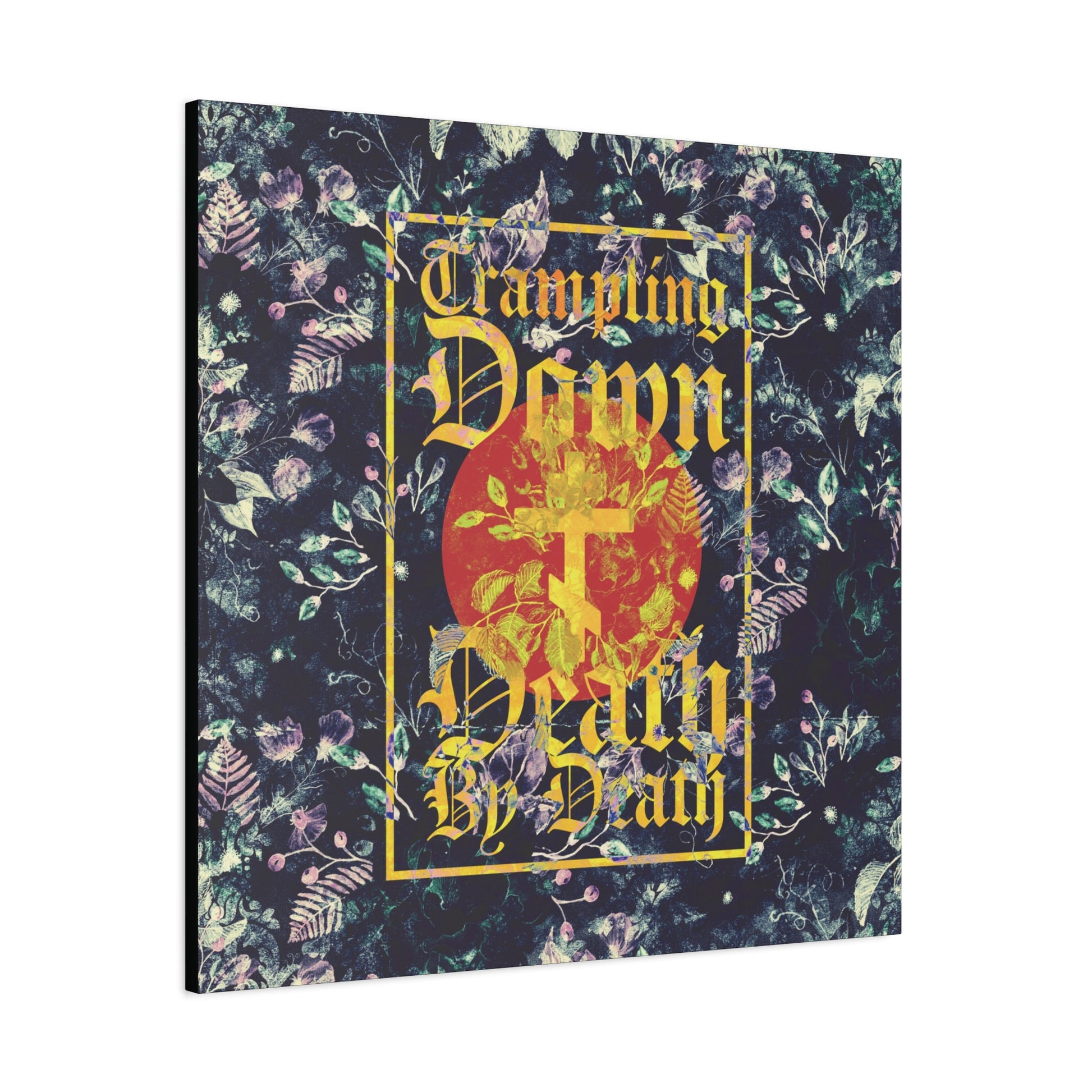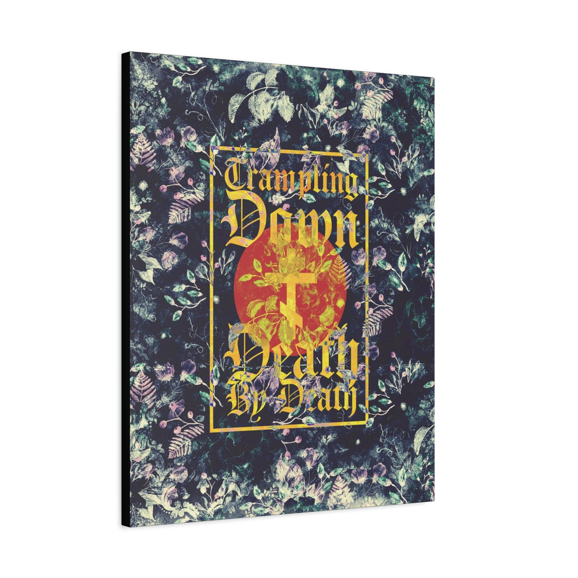 Trampling Down Death By Death | Paschal Floral Design with Gothic Script and Three-Bar Cross | Orthodox Christian Canvas Art