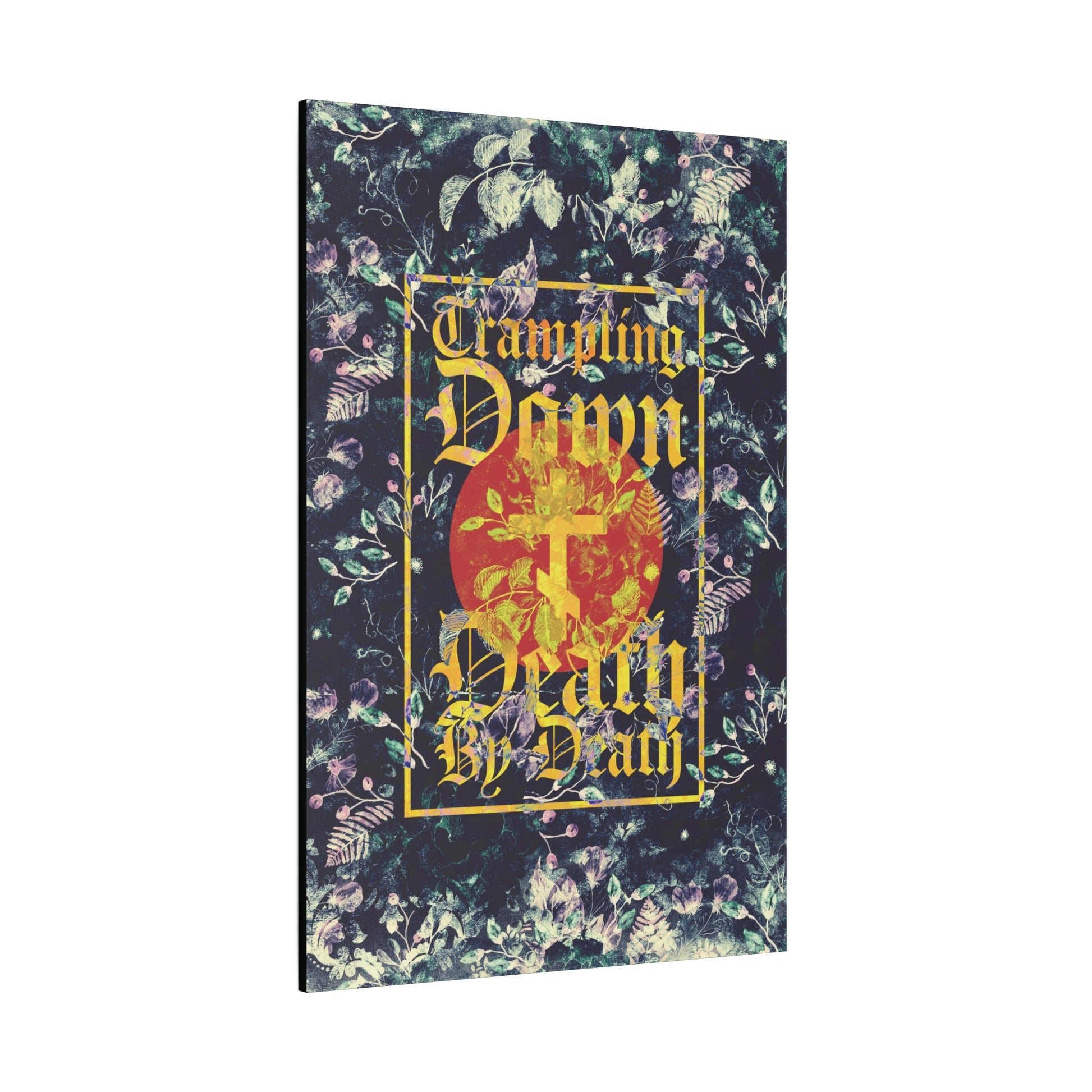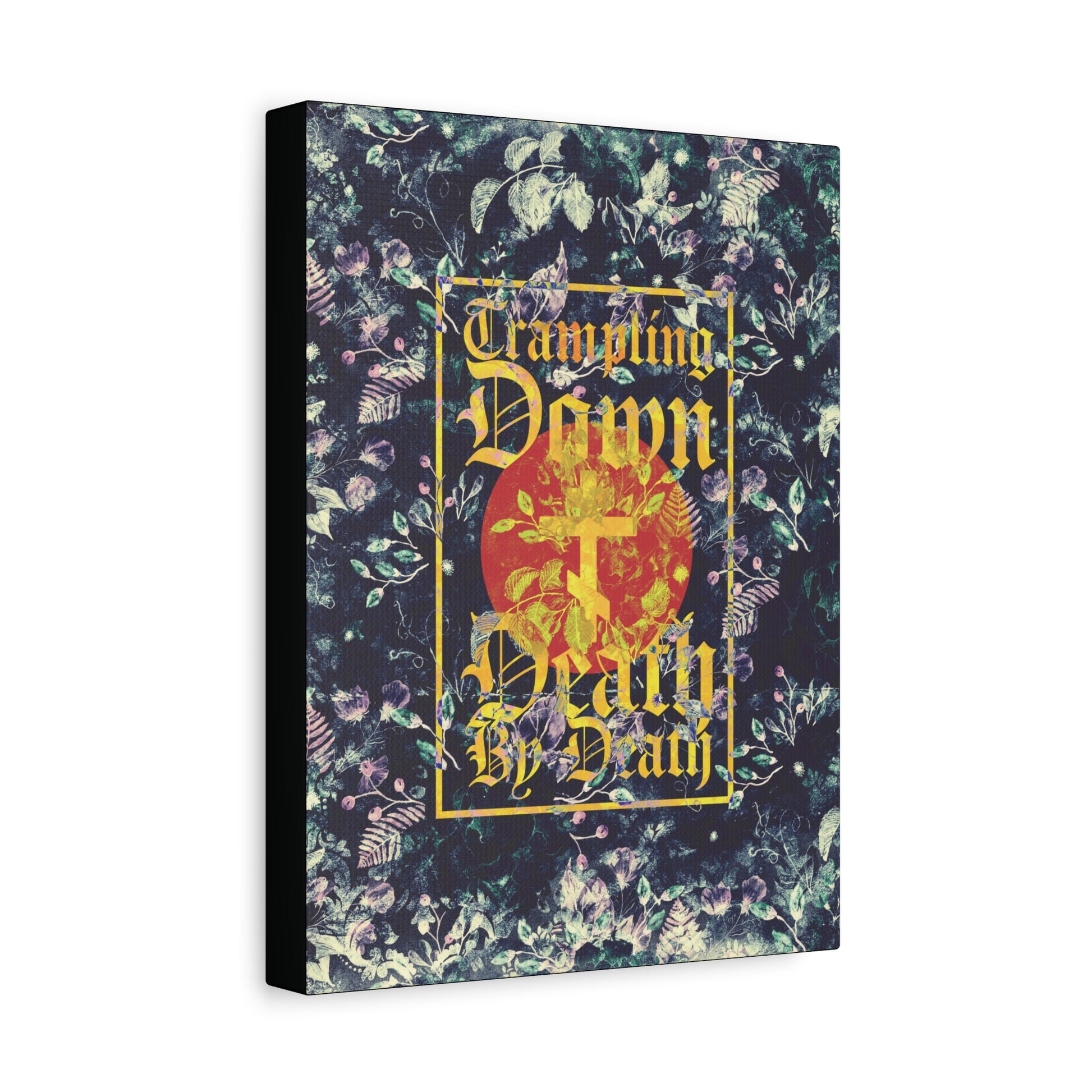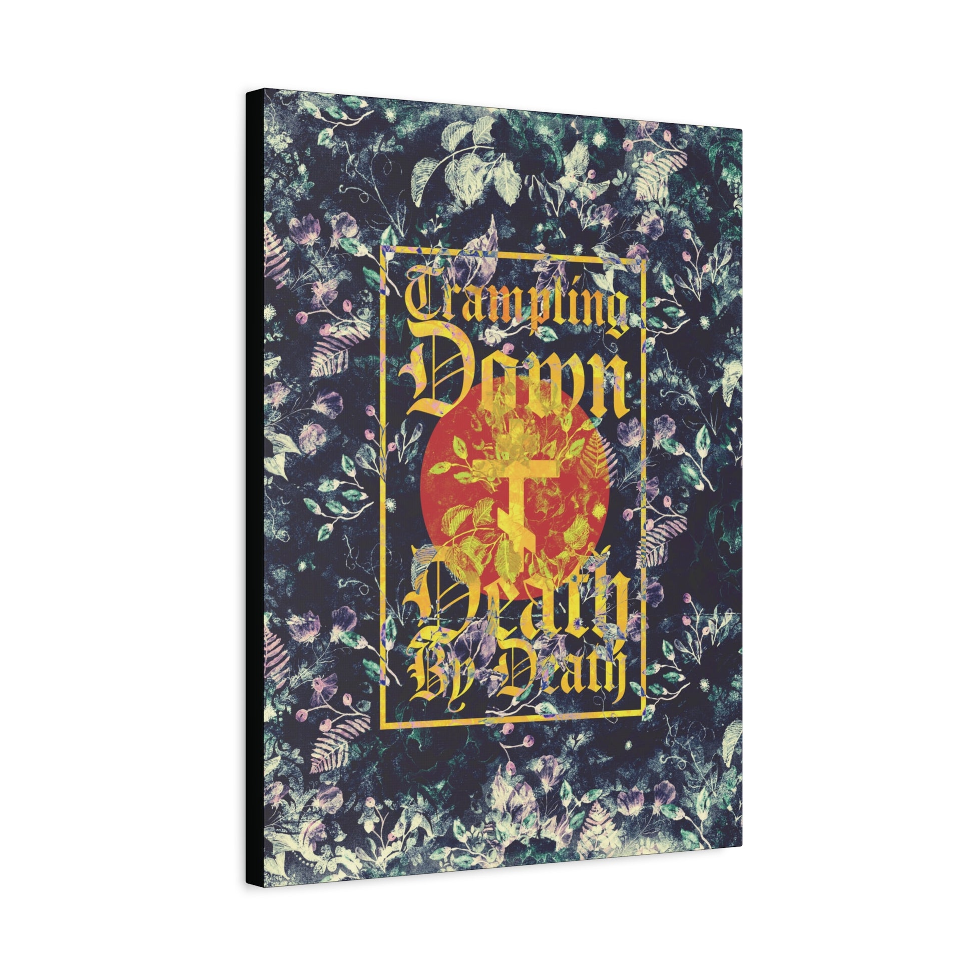 Trampling Down Death By Death | Paschal Floral Design with Gothic Script and Three-Bar Cross | Orthodox Christian Canvas Art