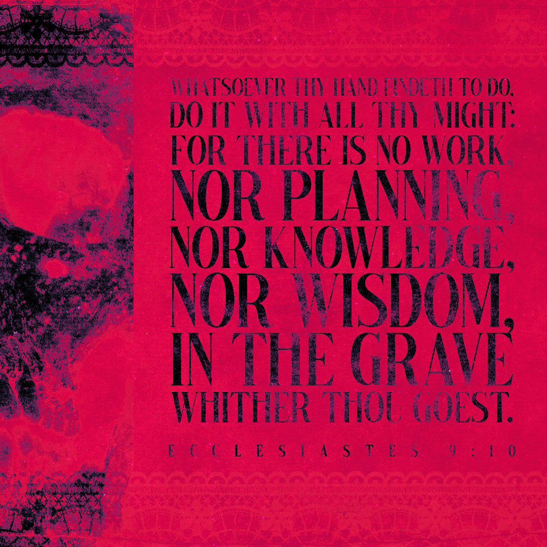 Whatsoever thy hand findeth to do, do it with all thy might: for there is no work, nor planning, nor knowledge, nor wisdom, in the grave whither thou goest.